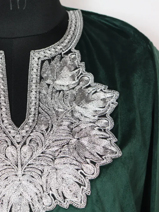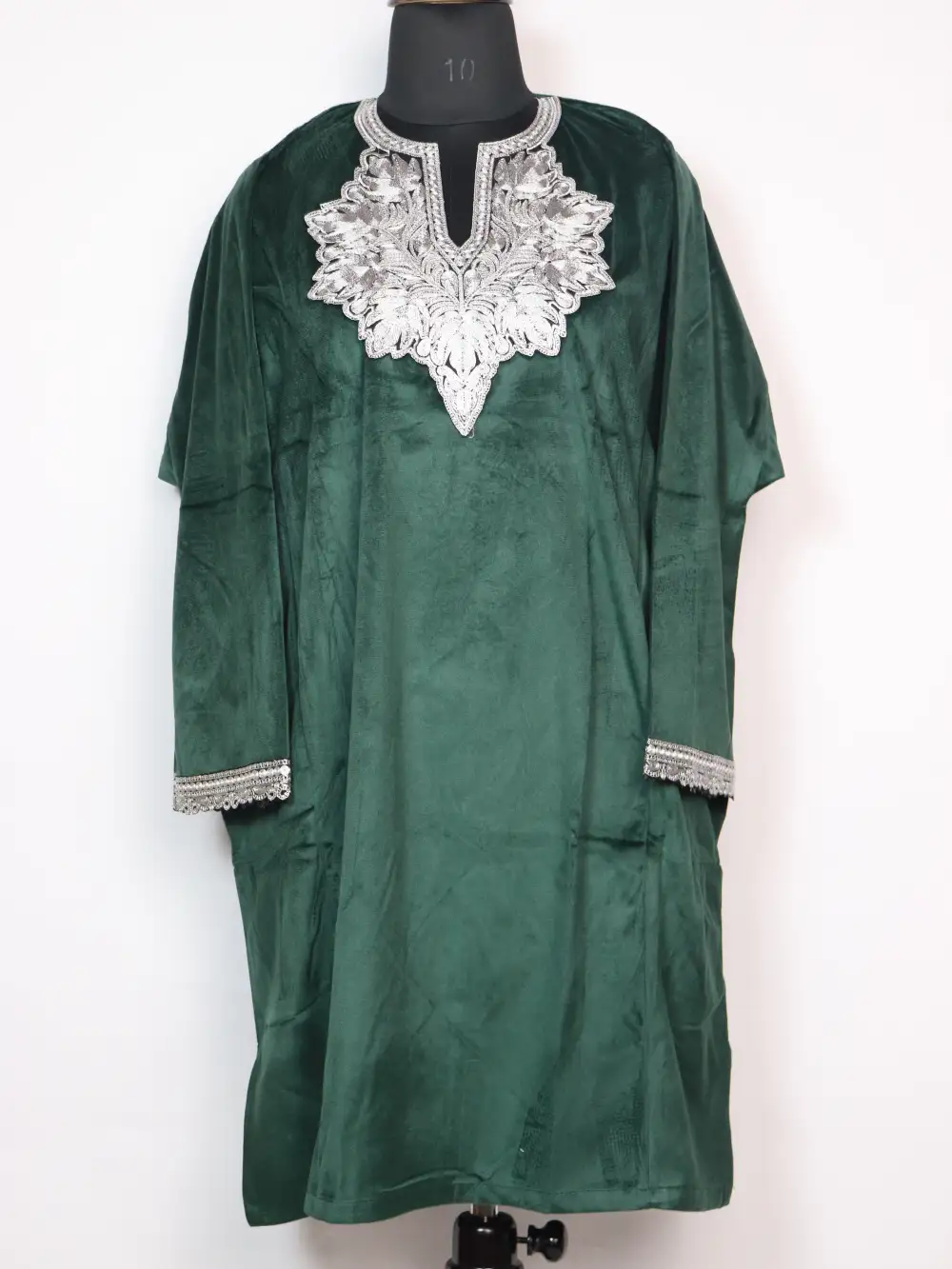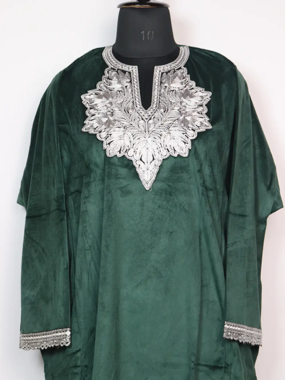 Velvet kashmiri phiran in dark green hue features Zari Tilla embroidery at neckline. It comes with chest size 56 inches with length 39 inches for generous drape.