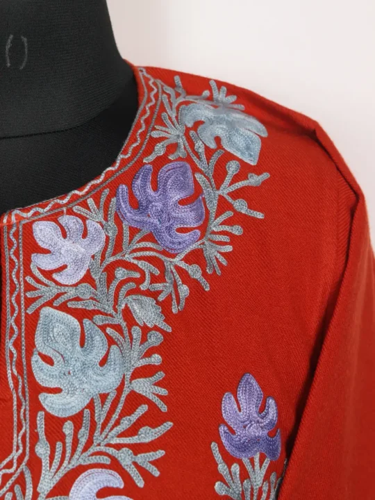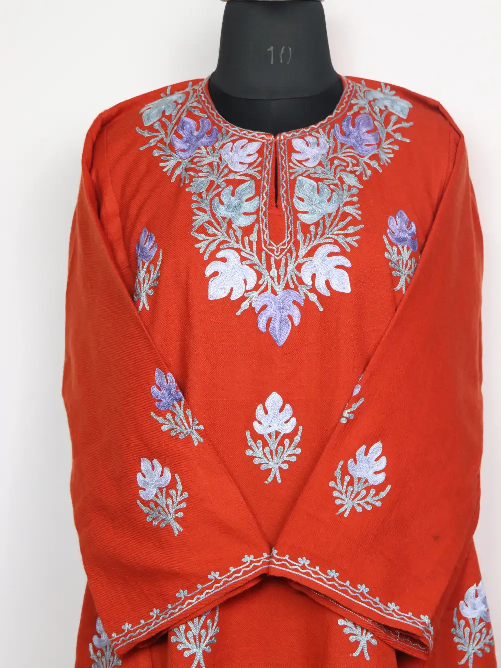 This cashmilon wool pheran feels warm and soft, and the neckline is decorated with neat chinari aari embroidery with bootis. It has pockets on both sides.