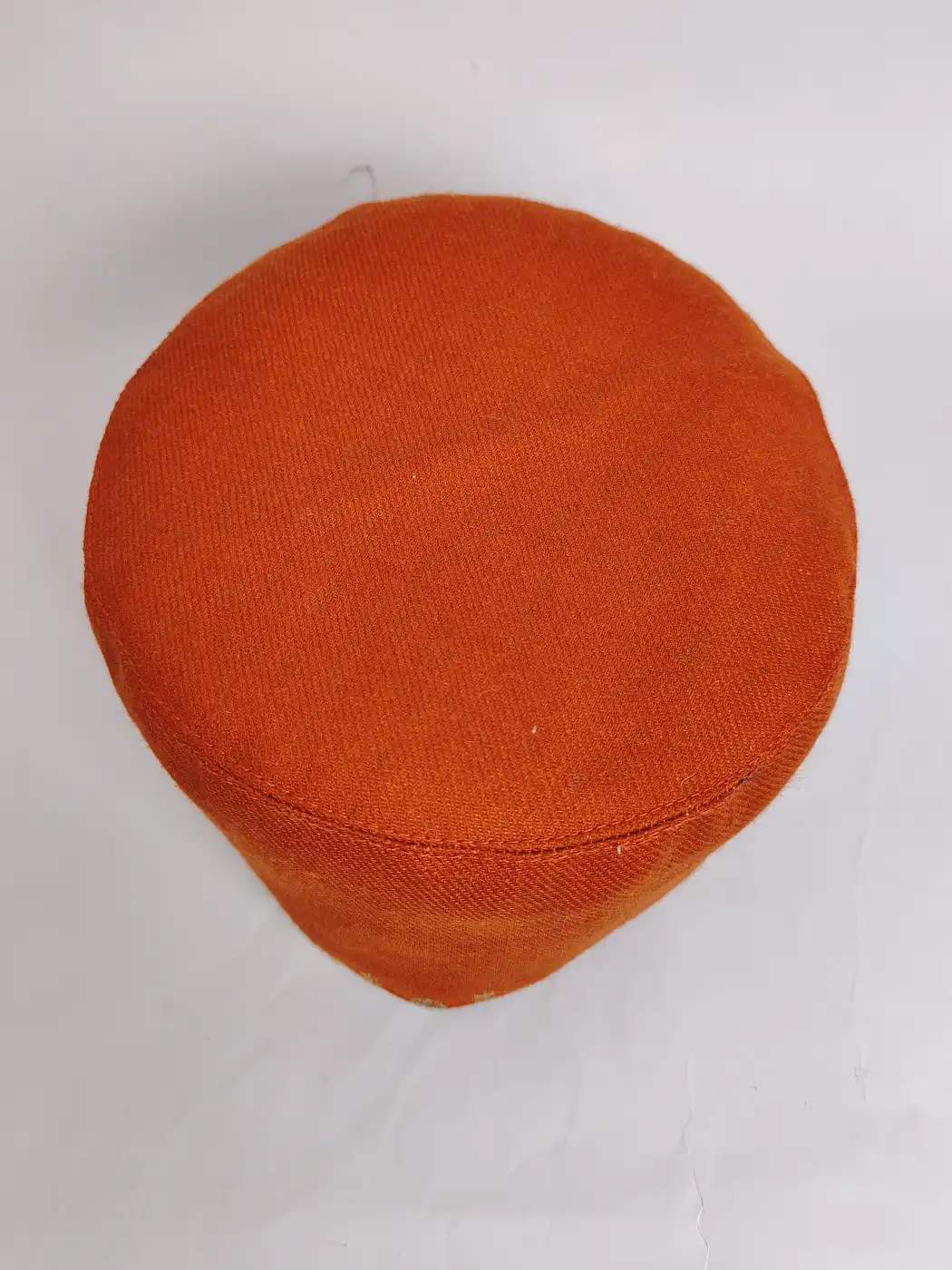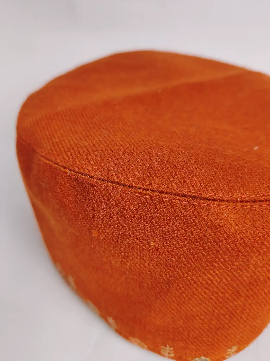 Bright in orange but balanced in expression, this classic cap carries a warmth which feels instantly uplifting. Its delicate sozni work embroidery is placed only along the border line, which adds subtle detail without overwhelming the clean surface. This cap blends simplicity with character, makes it easy to style while still feeling thoughtfully crafted and distinct.