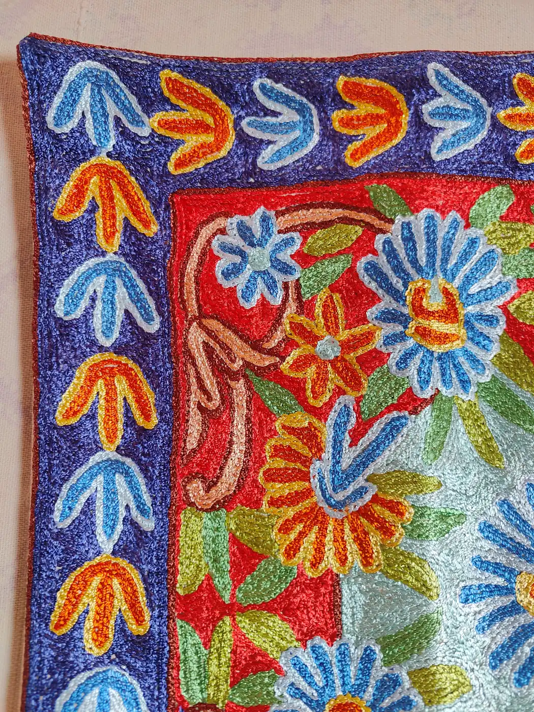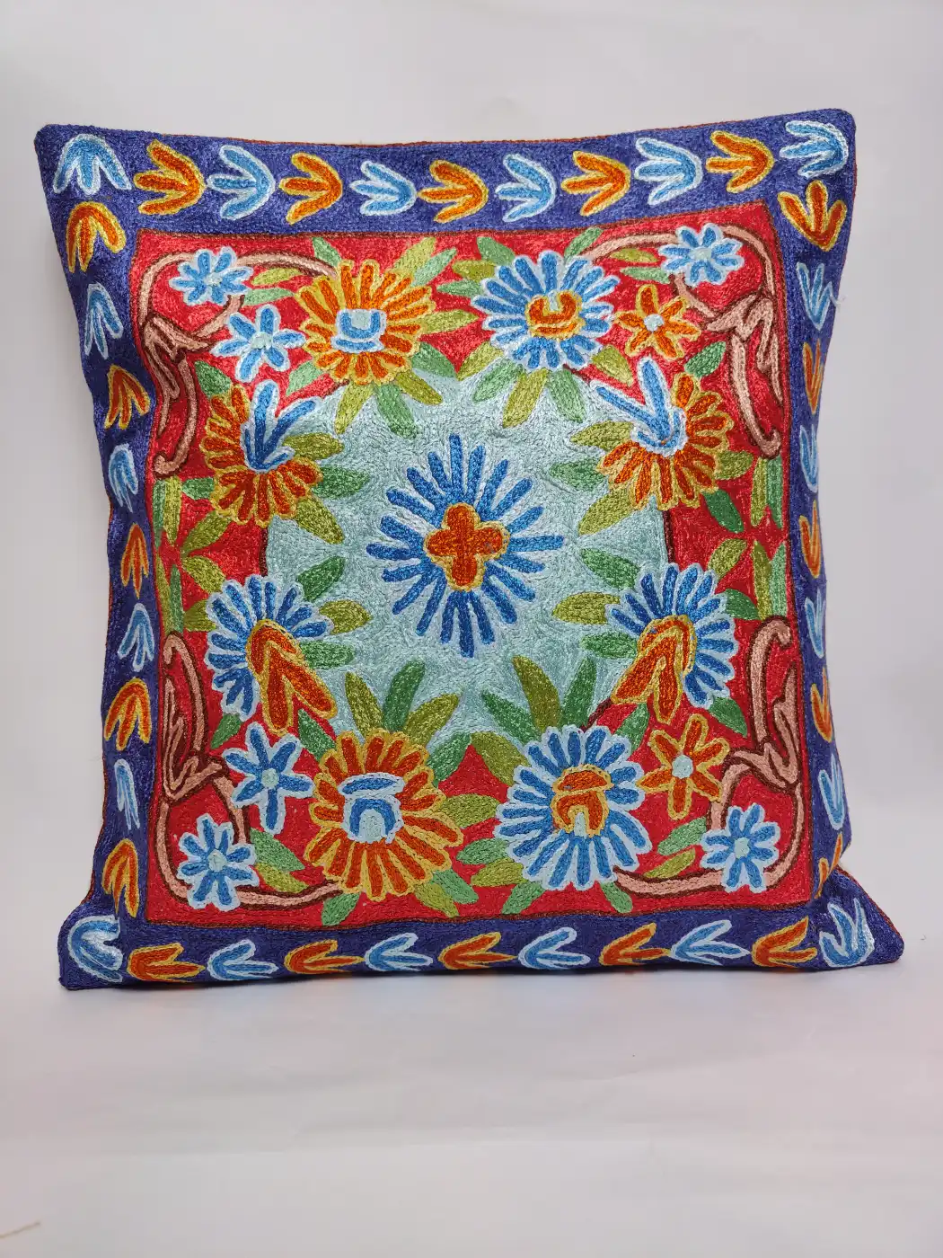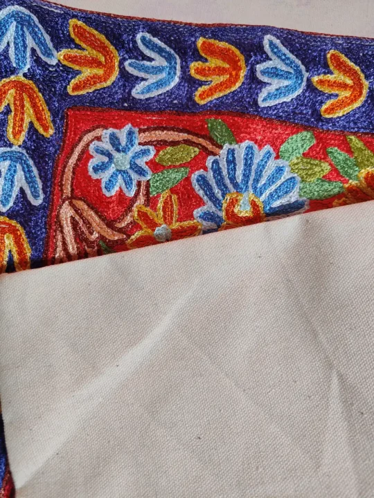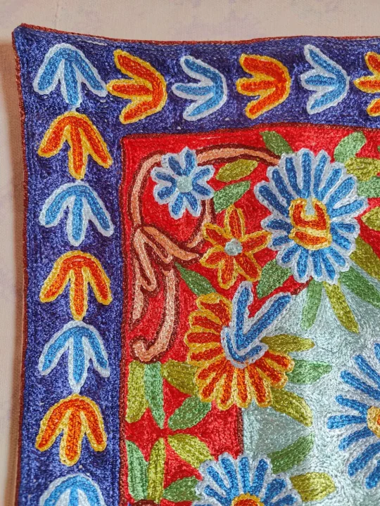 Made in Dusoot cotton for welcoming homes, this cushion cover carries Kashmiri hand chain stitch embroidery using silk threads forming flowers. It enriches sofas, adds softness, protects cushions, and gives warmth, tradition, and artistic handcrafted appeal to interiors.