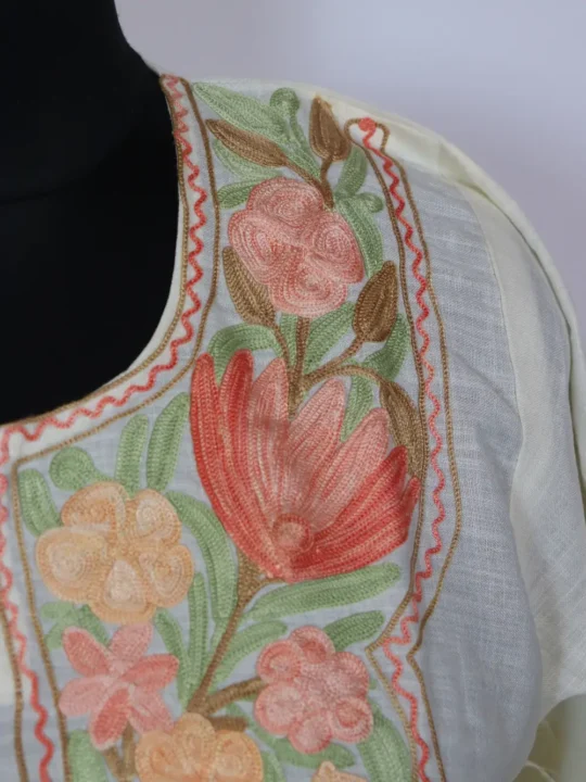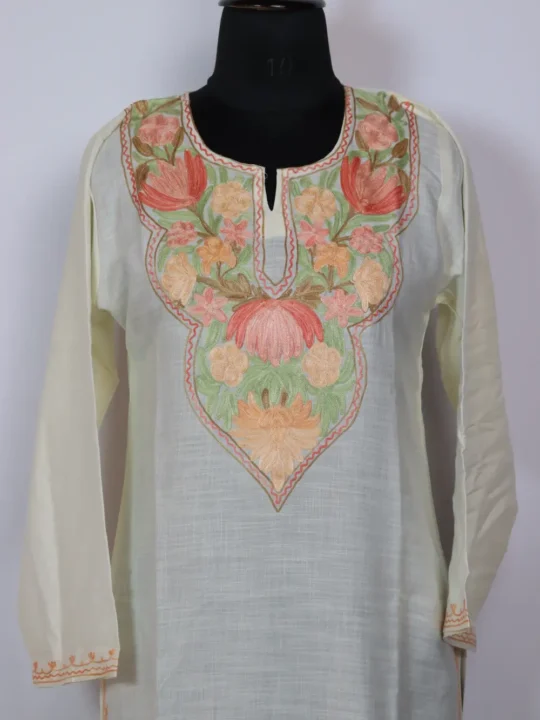 A classic cream colour Kurta set in Ruby Cotton with floral Aari at the neckline — it includes Kurti and trouser for an easy coordinated look. This beautiful Kurta set suits office or casual use and gives a neat, embroidered focal point at the neck.