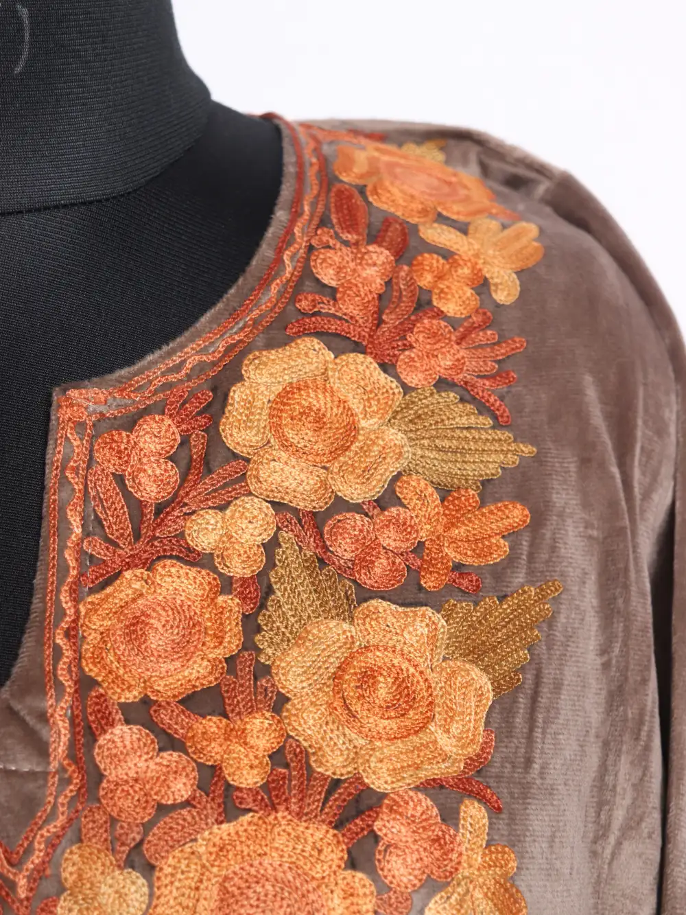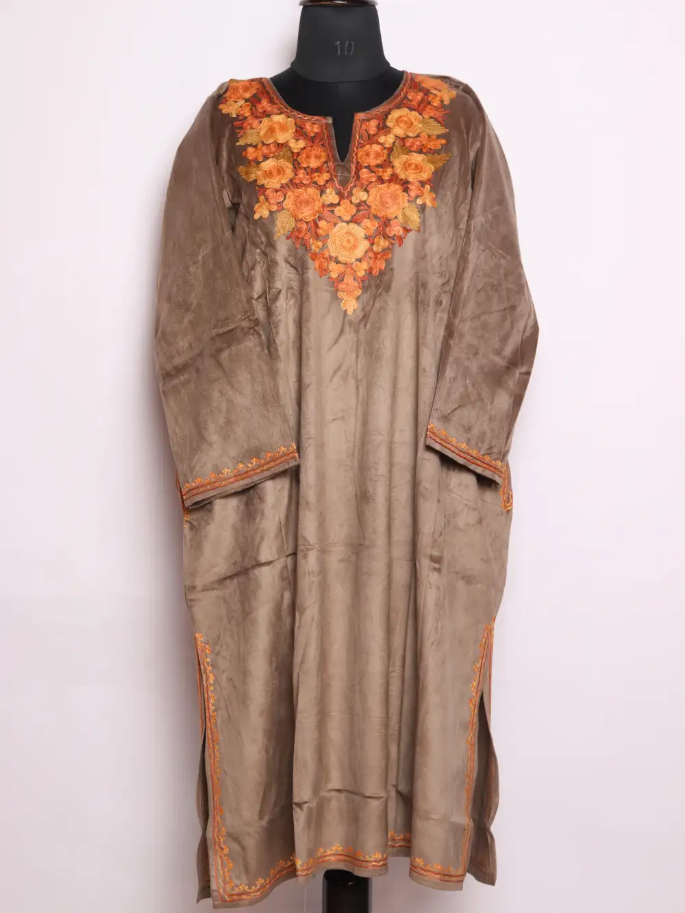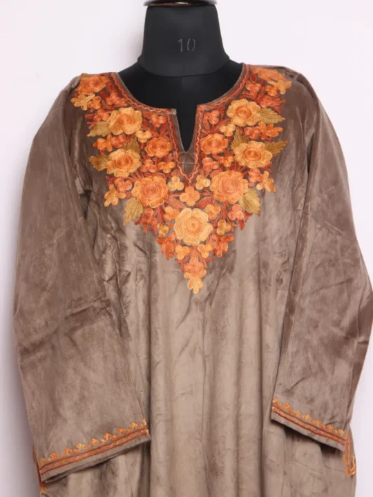 A plush Makmal Pheran in grey hue with a floral Aari neckline worked in brown hue threads in 50 inch chest and 43 inch length. This firan balances comfort and refined stitch work so the neckline becomes the quiet focal point. You can wear this phiran dress to layer over trousers or to finish a more formal winter look.