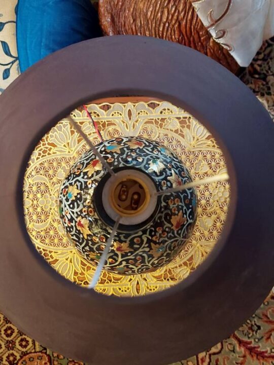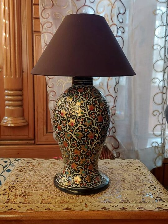 This is a beautiful Kashmiri table lamp. The base is handmade and the design is handcrafted on it. The total height of the table lamp is 16 Inches.