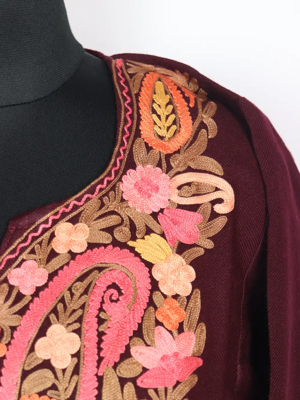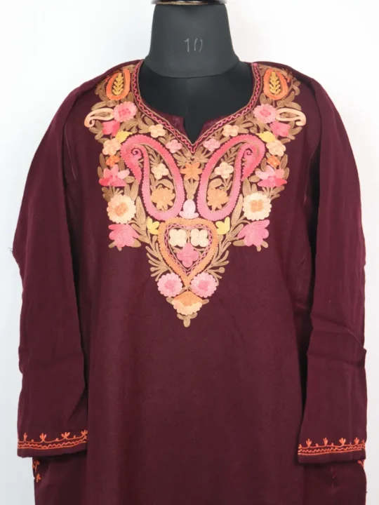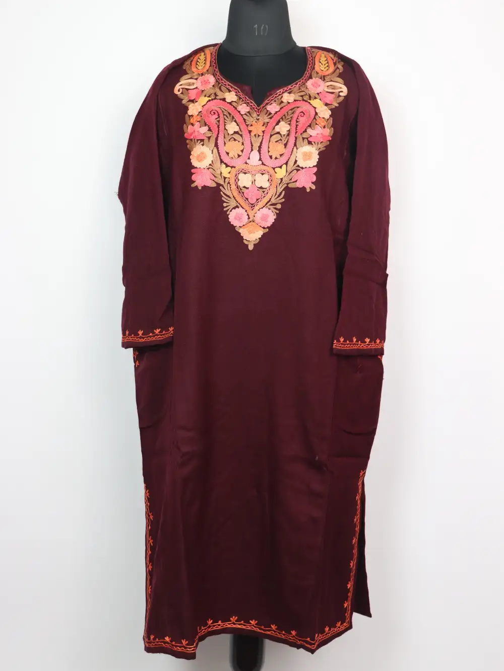 Kashmiri wine colour pheran have been created in cashmilon wool. It brings Aari embroidery at the neckline where floral and badam motifs are stitched into a decorative frame. It includes pockets both side for functional comfort.