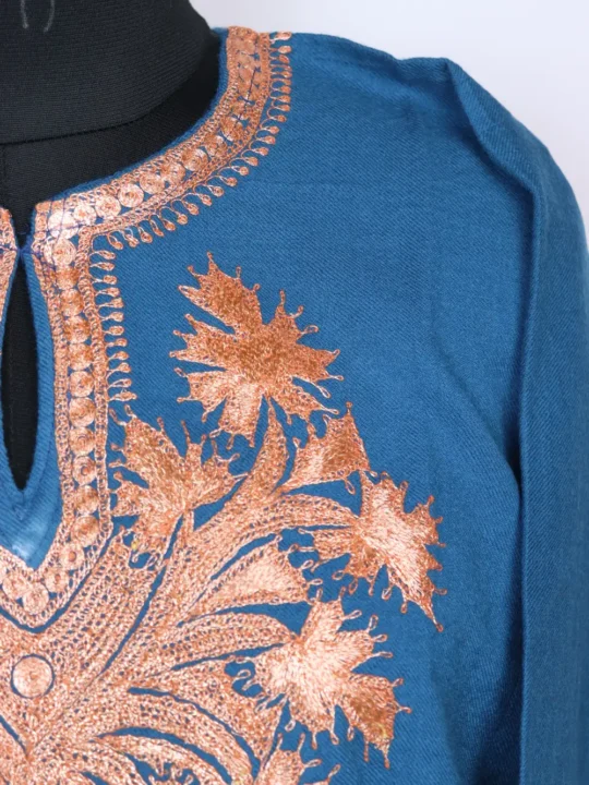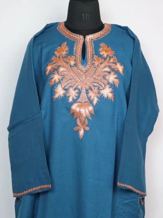 The raffal wool base and Botte Tilla work in chinar shape around the neckline mark this blue Kashmiri Pheran, it becomes practical with Pockets that are kept on both the sides. This Pheran carries a subtle ceremonial shimmer while keeping it calm