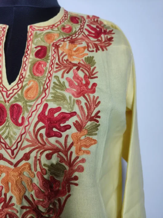 Shaped in summer cool cotton for sunny days, this pastel yellow colourgirls kurti features aari embroidery at neckline in floral motifs.