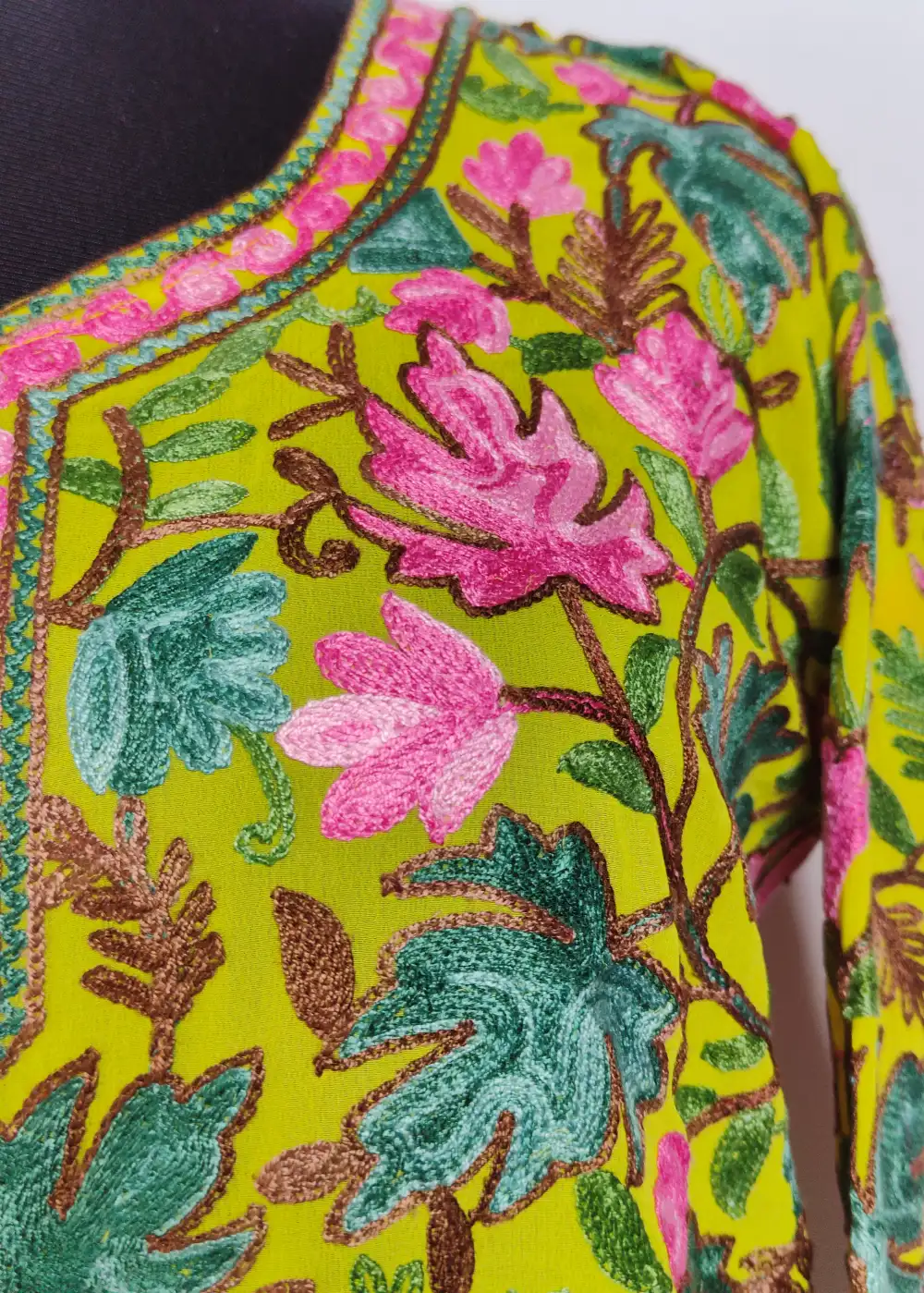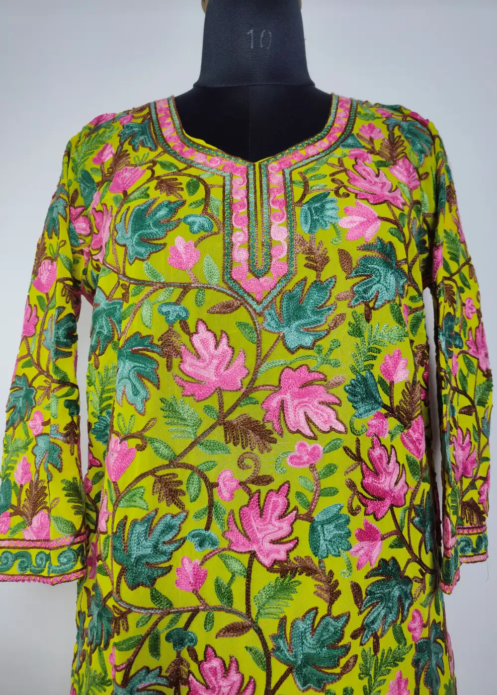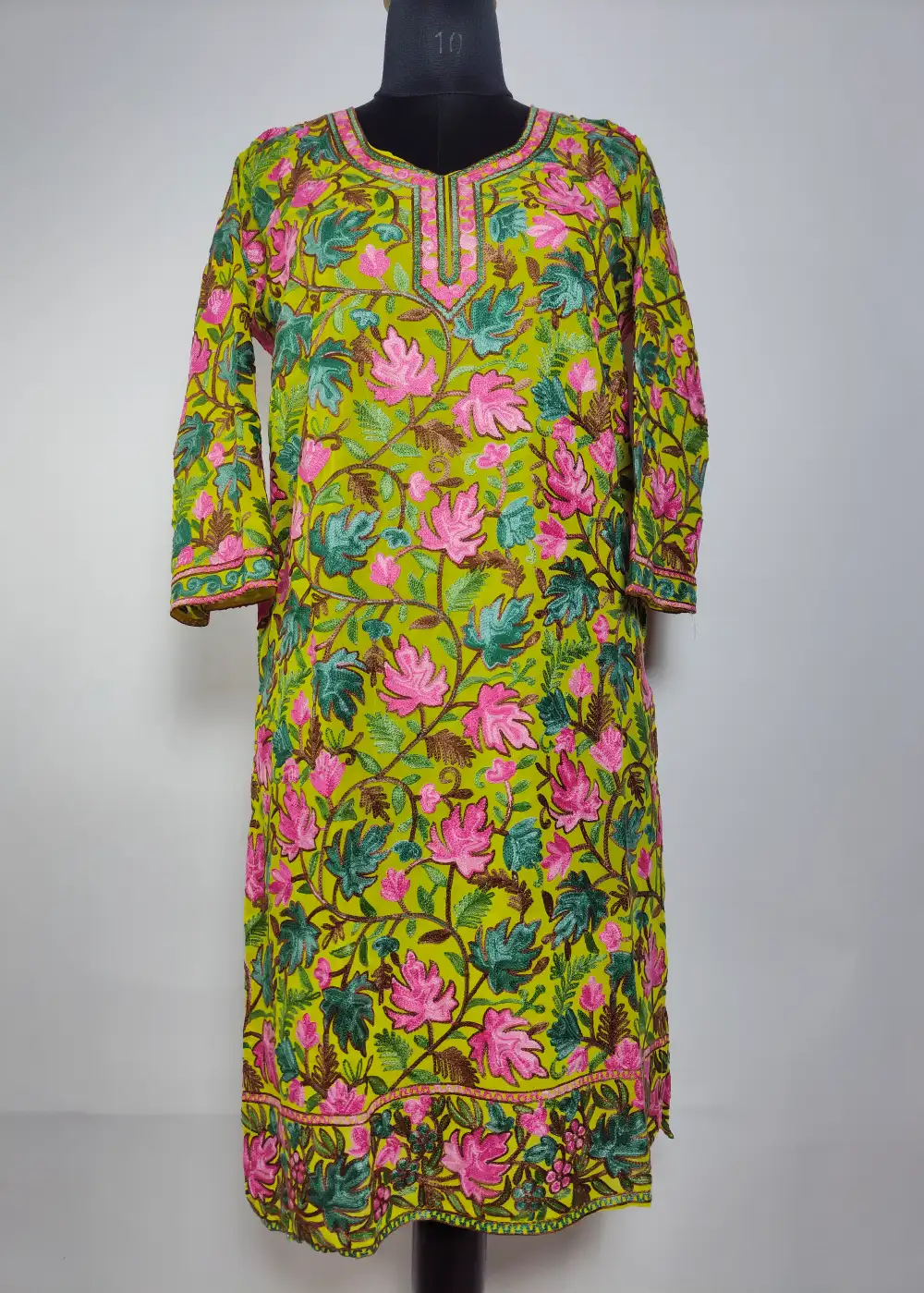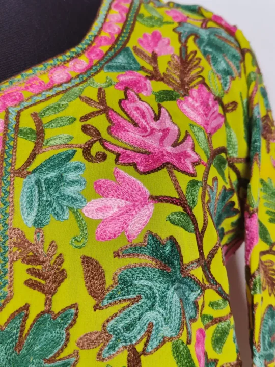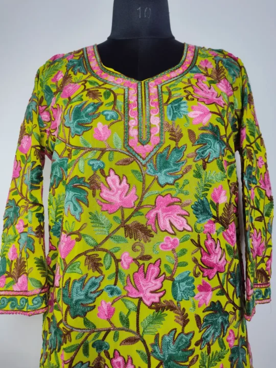 This long stylish georgette kurti has chinar aari on the front and back that gives it a classic feel. The fabric is light and has a natural fall, so it sits well when worn. Easy to style for daily use, it looks good with jeans, straight pants, or simple leggings.