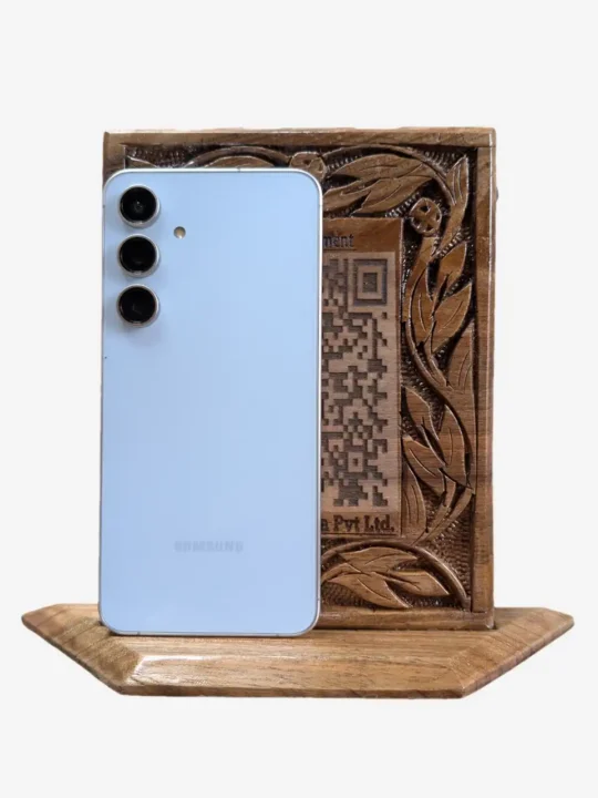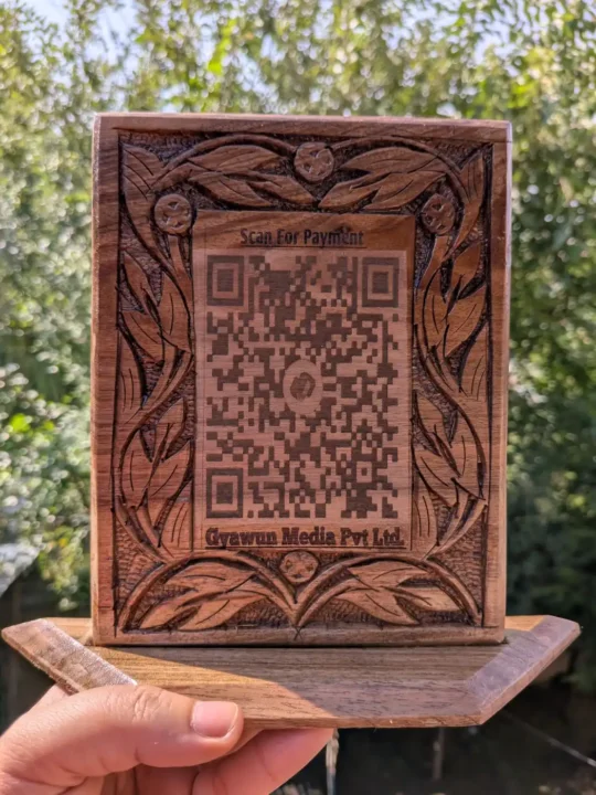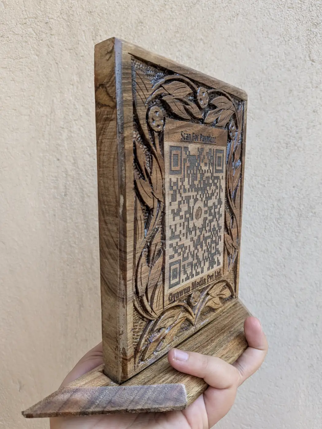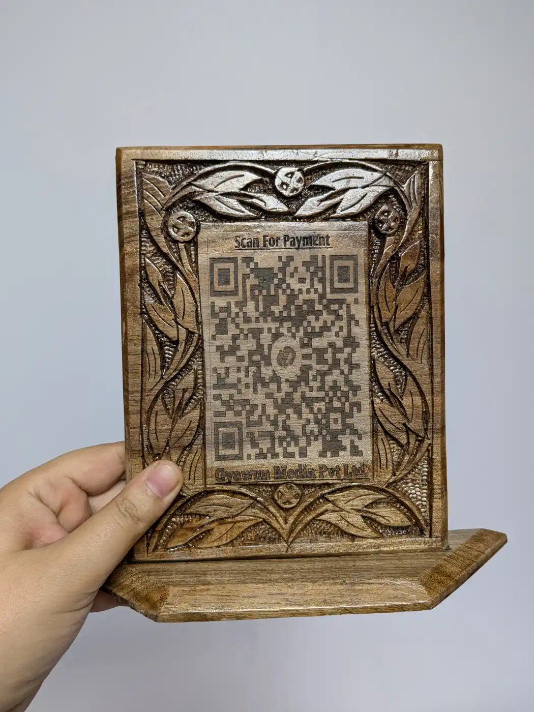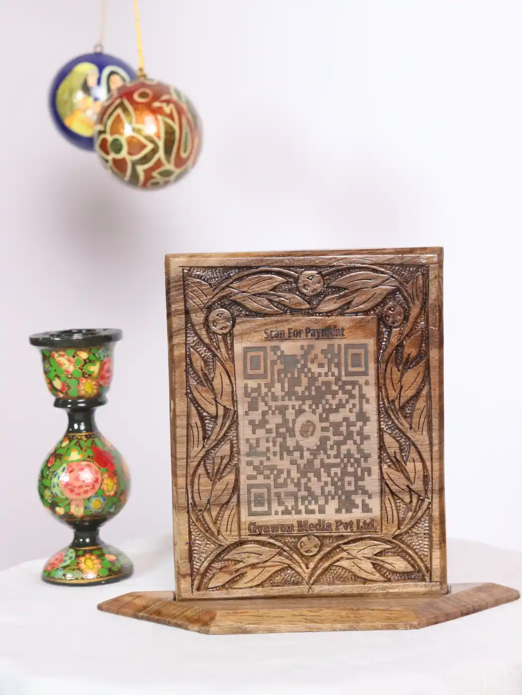 UPI payment, especially the QR code scanner, has taken India by storm. While everyone has the boring QR stickers, your business will stand out with our hand made QR scanners in walnut wood. Made in Kashmir from original and authentic walnut wood, this hand-carved wooden QR Scanner, is a tribute to the region’s carving tradition and a blend of modern things. You can use it to show QR code for products, payment links, location, event info, etc. This wooden QR code for your business brings a unique and luxurious touch to while your custom name or logo adds a personalized statement.