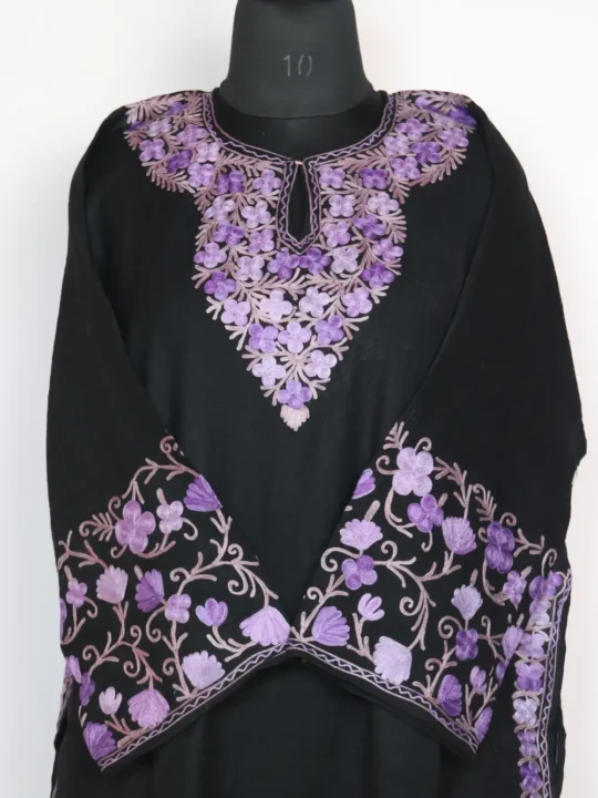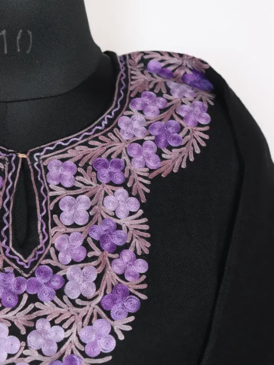 A black pheran dress in Raffal Wool carries floral Heavy Aari work at the daman, neckline, sleeves and pockets both side for everyday utility. The pheran dress keeps styling modest and calm, offering a soft Kashmiri vibe without heavy surface ornamentation.
