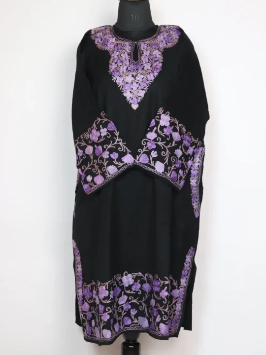 A black pheran dress in Raffal Wool carries floral Heavy Aari work at the daman, neckline, sleeves and pockets both side for everyday utility. The pheran dress keeps styling modest and calm, offering a soft Kashmiri vibe without heavy surface ornamentation.