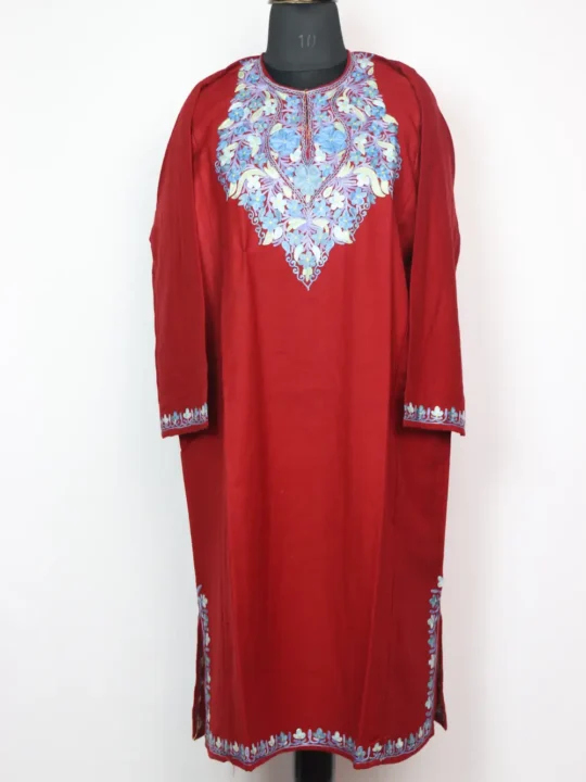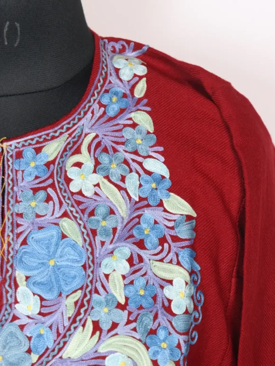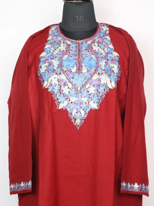 Designed with neat floral aari detailing around the neck, this cashmilon wool pheran comes with comfort and a touch of elegance. It has two side pockets which adds to its functionality.