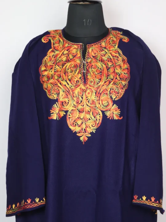This rekhta cahmilon faran has beautiful colorful aari badam floral embroidery at the neck, giving it a neat winter look. Comfortable and warm, it works well for everyday wear.