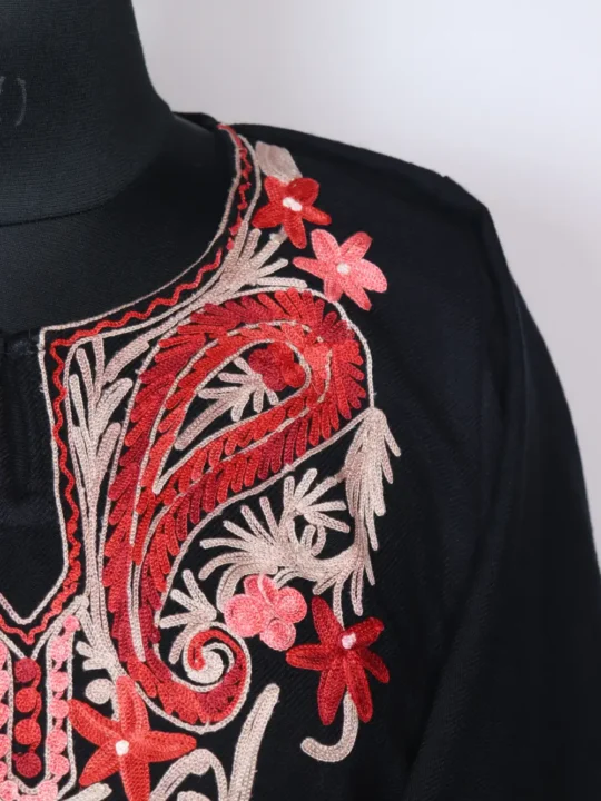 This 2pc pheran set is made from cashmilon wool and includes a matching lower in a classic black color. The neckline features detailed badam posh bagh aari kadhai with beautiful bootis on sleeve border and front daman.