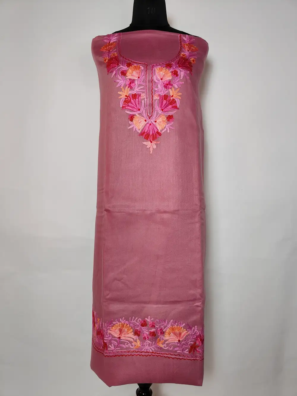 Cashmilon Wool unstitched suit fabric in pink colour presents Aari work at the neckline and border in floral patterns. It is supplied as a 2pc set — salwar and kameez that are unstitched so you may stitch it to your size.