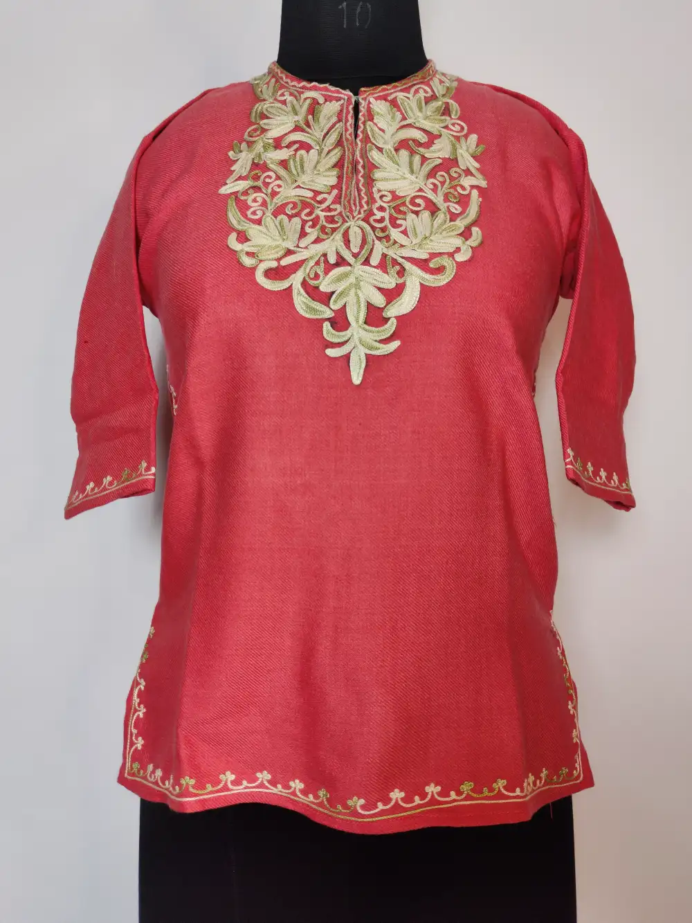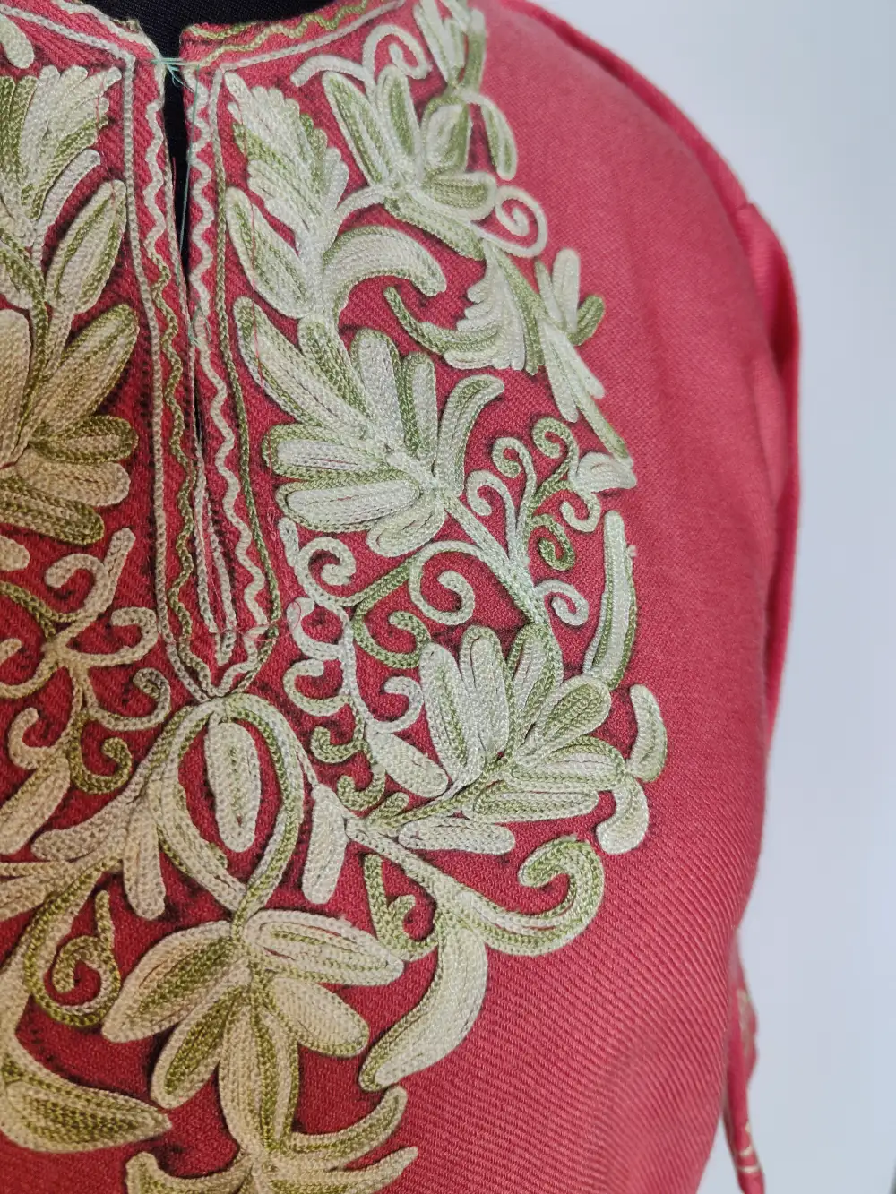Black colour kids phiran features cashmilon wool warmth and delicate Kashmiri aari embroidery at the neckline in floral work. It is sweet, soft, and easy to wear, finished with both-side pockets for comfort during winter days.