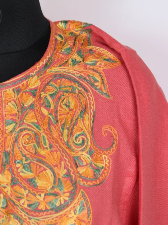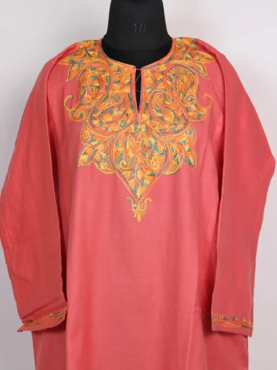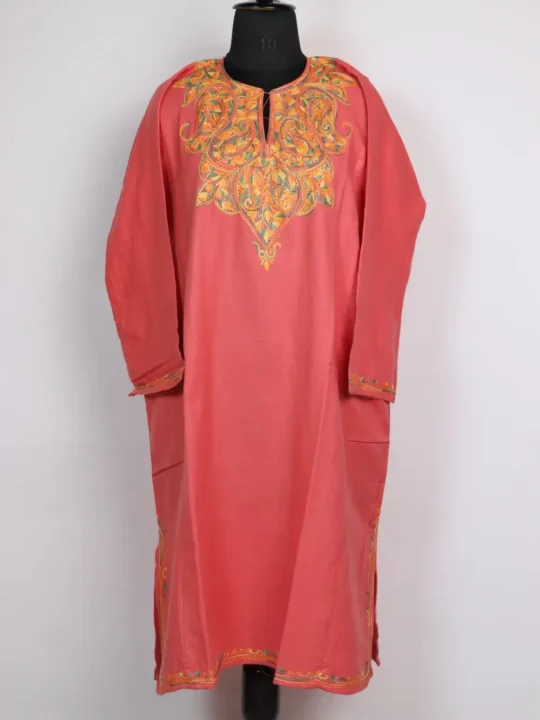 This elegantĀ pink pheran in soft cashmilon wool features exquisite Badam Aari embroidery, adding a rich Kashmiri touch to its design. It has a chest size of 50 inches and a length of 42.5 inches.