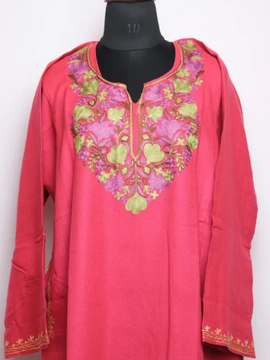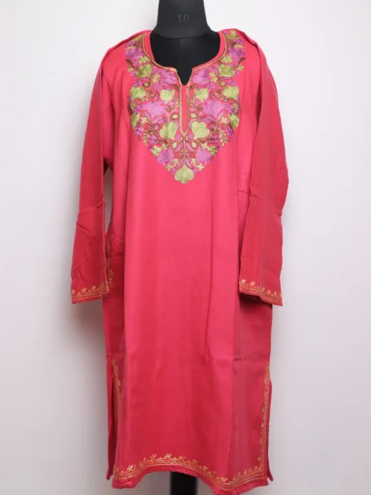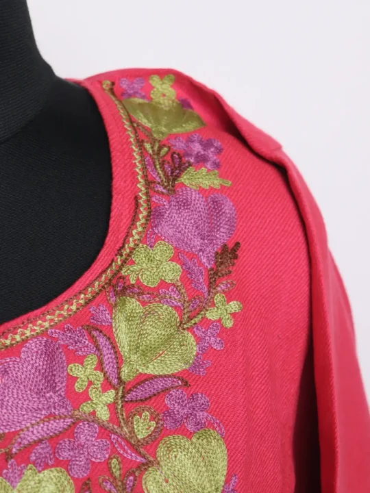 This cashmilon wool firan shows a gentle touch of Kashmiri craft through its floral neckline aari kadhai.