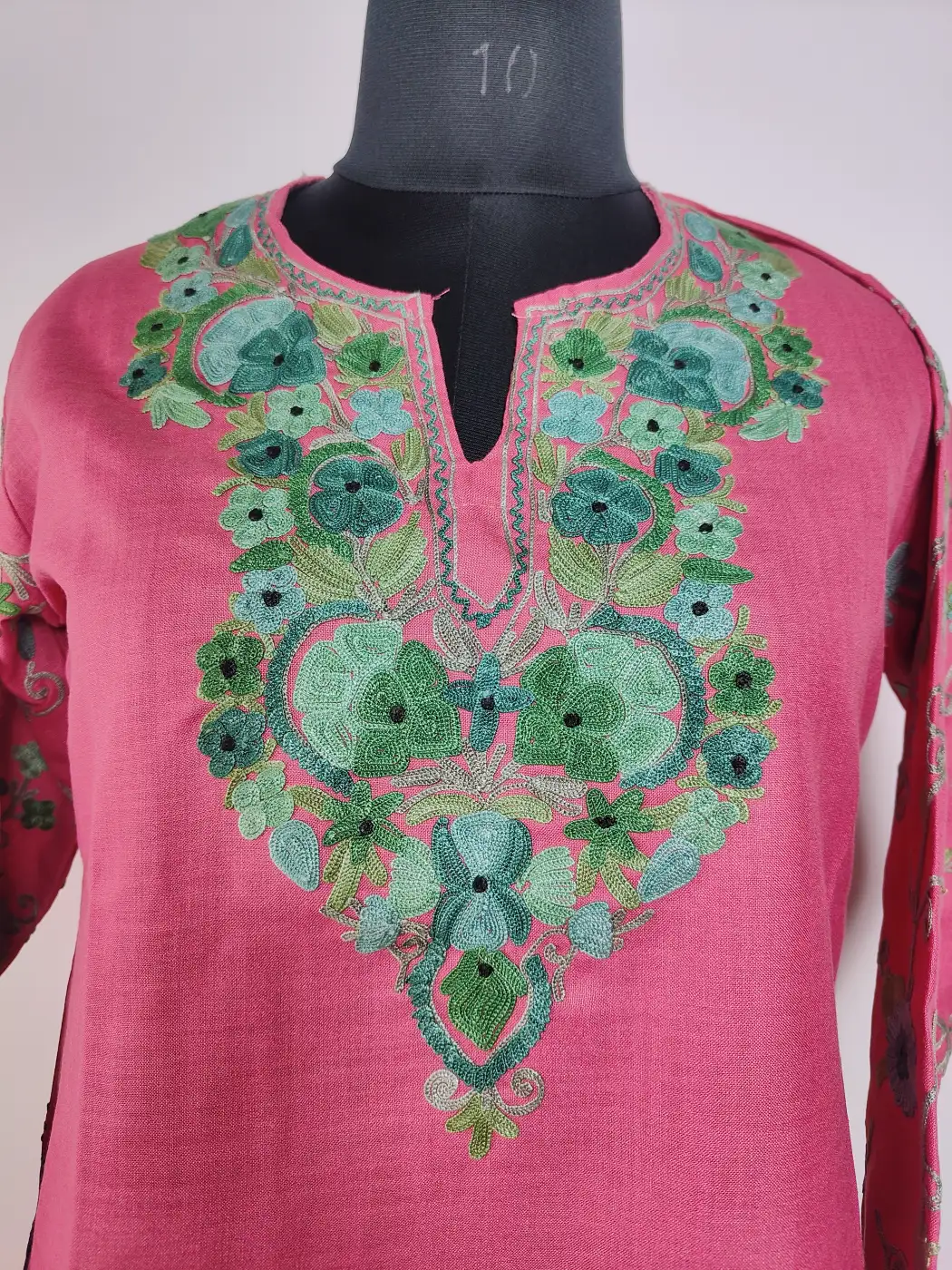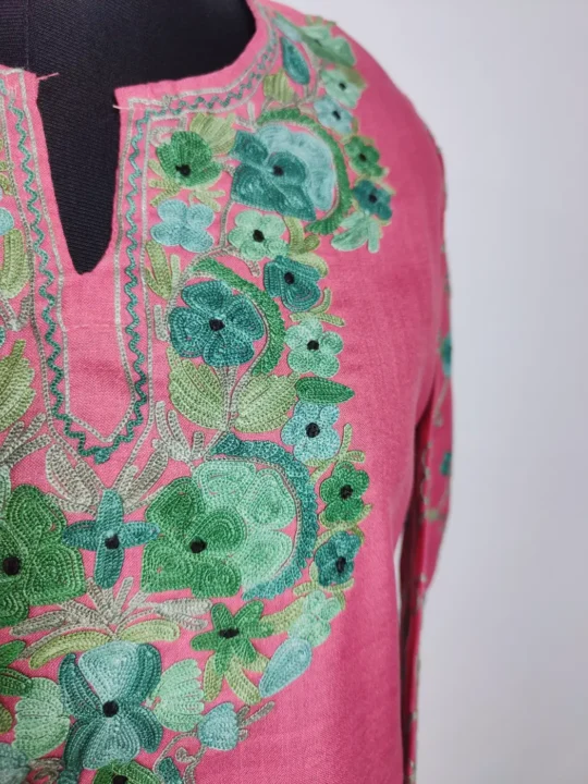 Crafted in ruby cotton for airy comfort, this pink colour kurta displays Kashmiri aari embroidery at neckline and sleeves in floral motifs. It comes in 40 inches chest size and 37 inches length, making it comfortable for daily wear.
