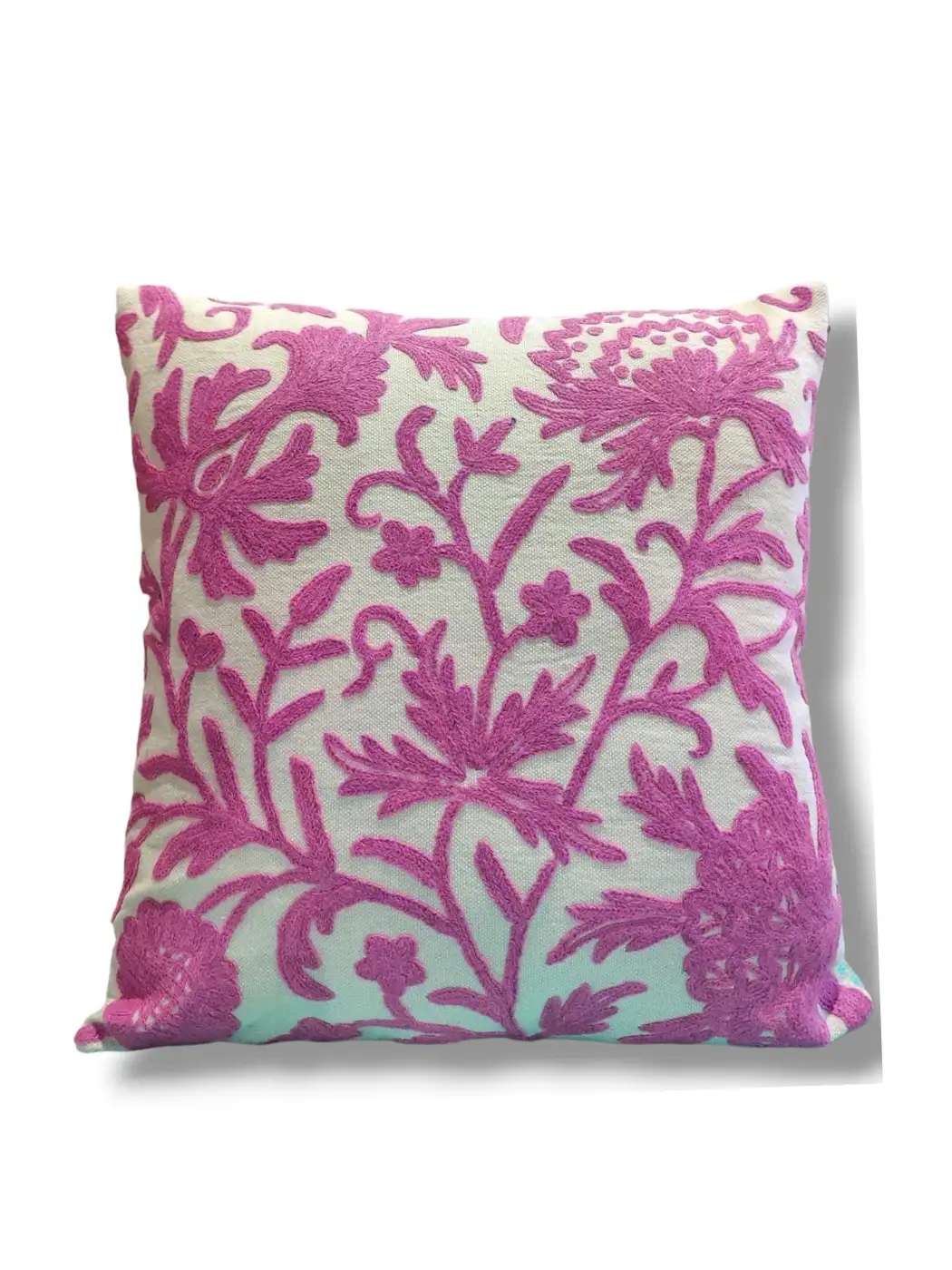 Pink on White Kashmiri Hand Embroidery Crewel Cushion Cover – Set of 2 (16×16 Inches)