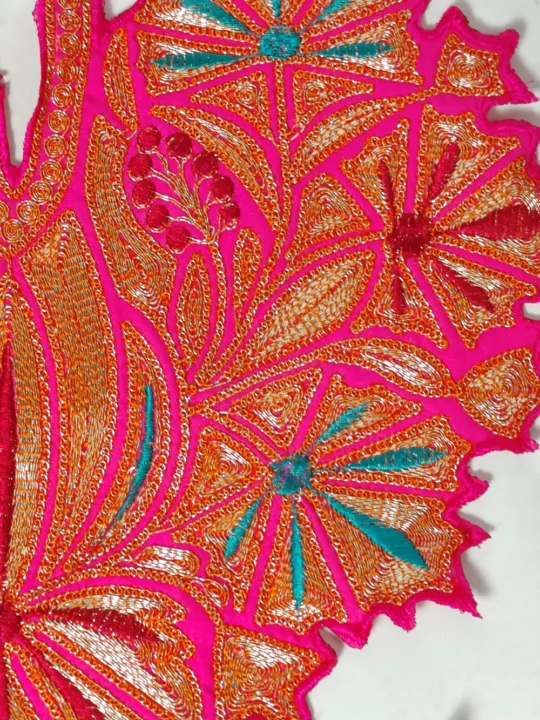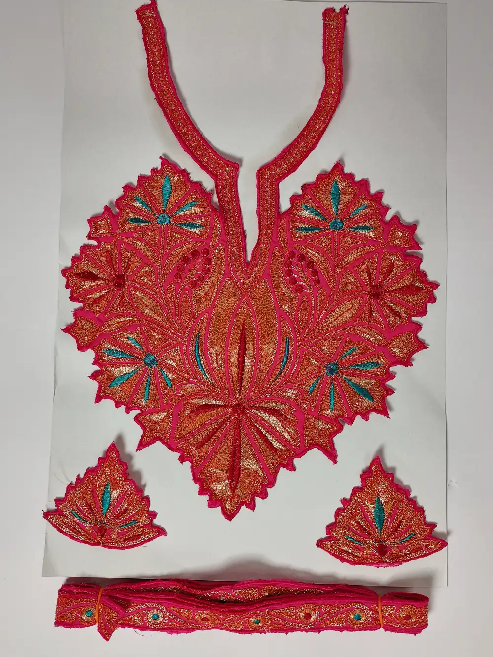 Crafted on pink colour base using tilla embroidery, it highlight Kashmiri charm. This patch enhances pheran fronts, kurti borders, or shirt designs.