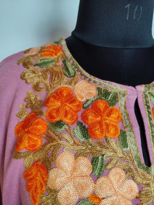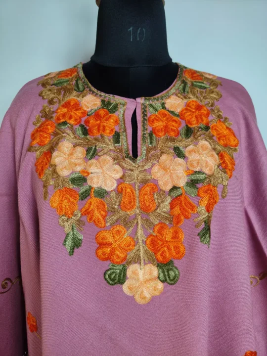 A pink colour online Kshmiri poncho cut from Cashmilon wool carries floral Aari at the neckline and continuous border embroidery, with a 68-inch side span and 34-inch length.