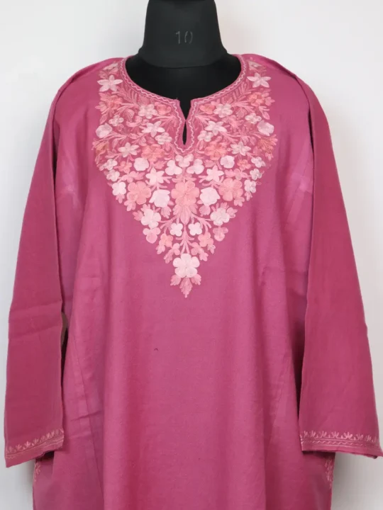 Raffal Wool in soft pink shapes this stylish Kashmiri pheran with floral Aari at the neckline. It comes with chest size 54 and length 43 that offer generous comfort.