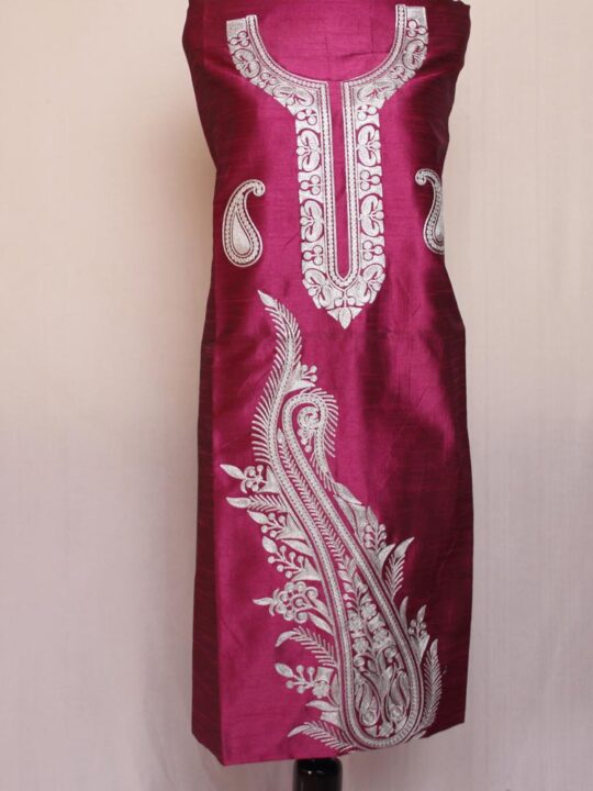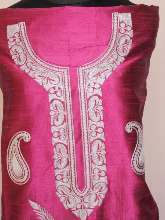 This is a raw silk unstitched 2pc suit with machine zari work done on it.