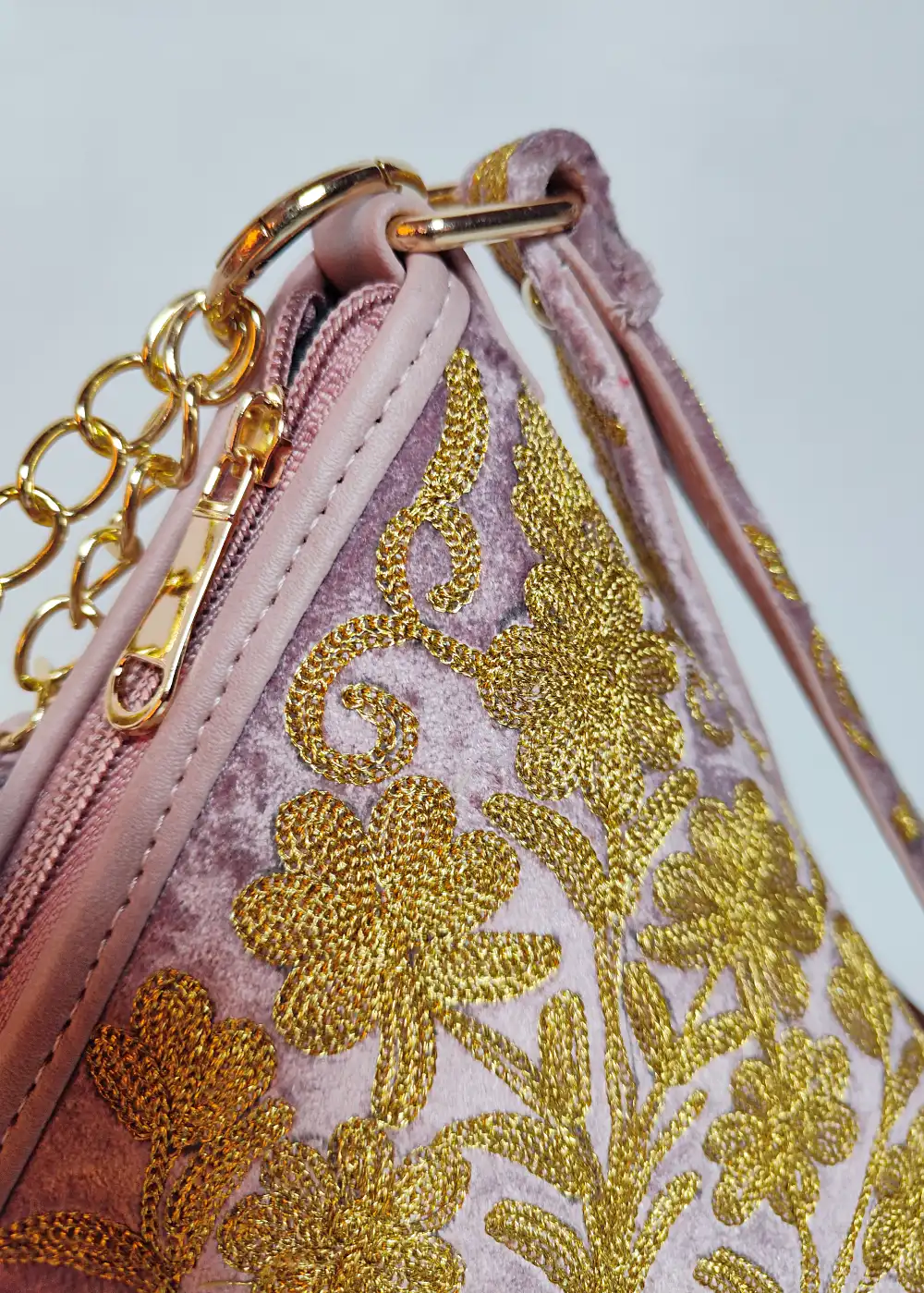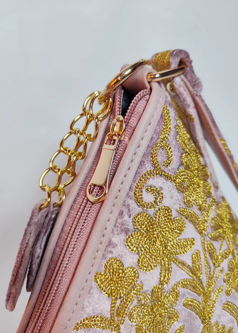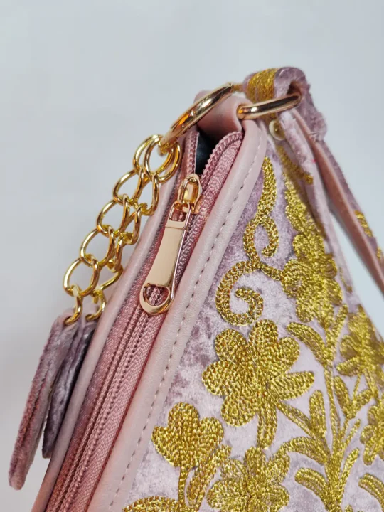 Made in soft velvet fabric, this Pink potli bag features detailed zari embroidery spread across the surface that adds a classic and elegant touch. The design looks eye-catching and pairs well with ethnic wear. A perfect pick for wedding functions, festive gatherings, and special occasions.