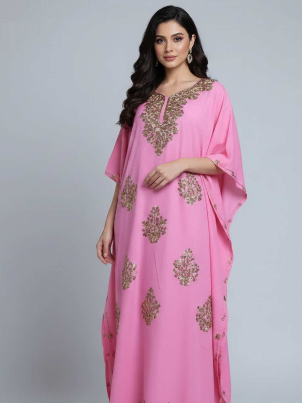 There’s something special about a kaftan that feels both effortless and expressive. This one does exactly that. Its crushed cotton fabric lets your skin breathe, and the delicate Kashmiri Aari embroidery adds just enough visual texture. You’ll love it for what it is—easy, thoughtful, and made for those slow, sunny hours.