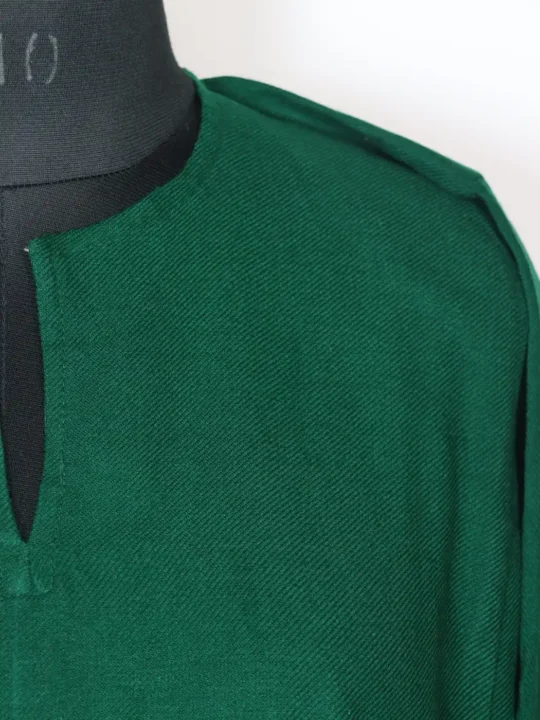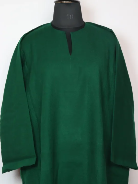 Crafted in cashmilon wool fabric, this green colored pheran set includes pheran and trousers. There is no embroidery done on it for elegant look.
