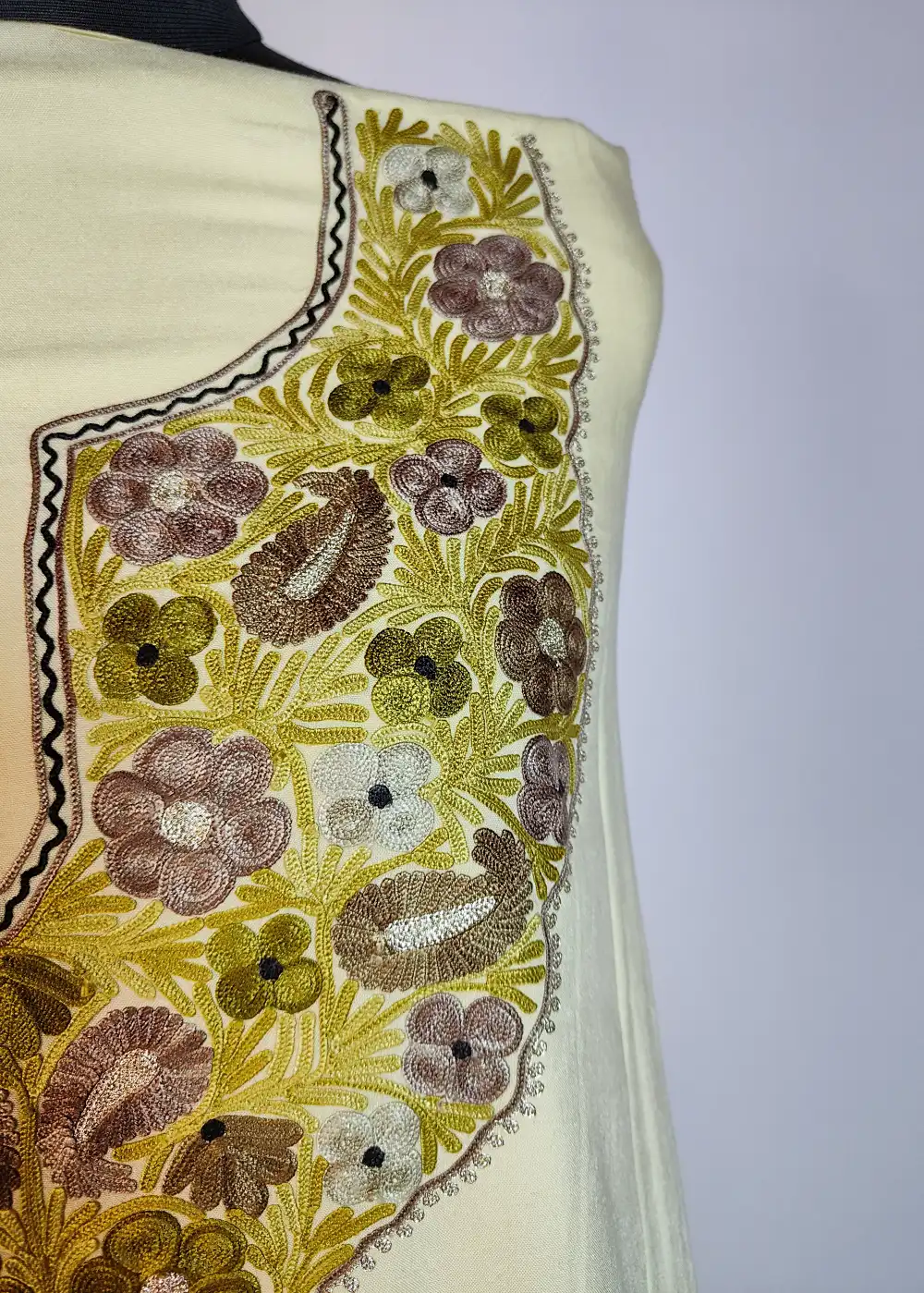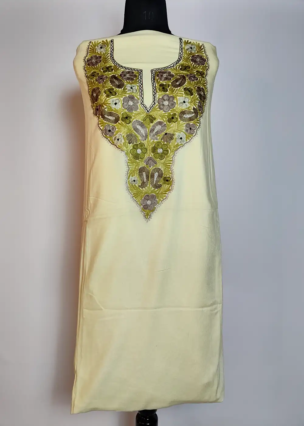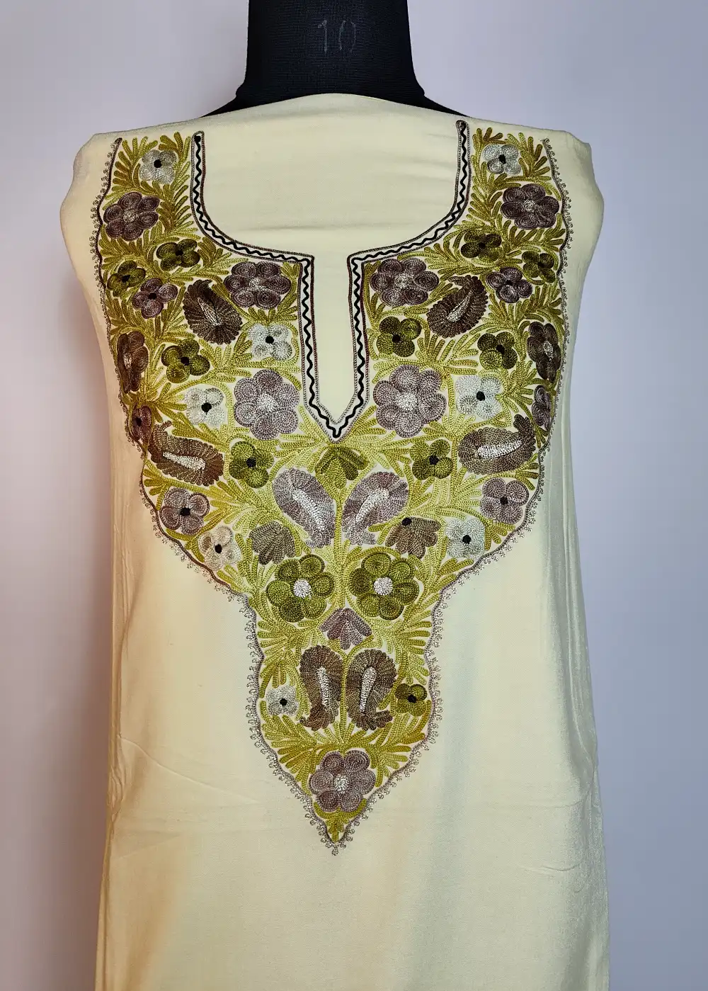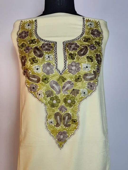 This Kashmiri designer suit comes with detailed floral and badam neckline aari and zari embroidery. The fabric is comfortable for daily summer wear. A nice option within Kashmiri suits for summer and embroidery suits for women, it is offered unstitched for your own fitting.