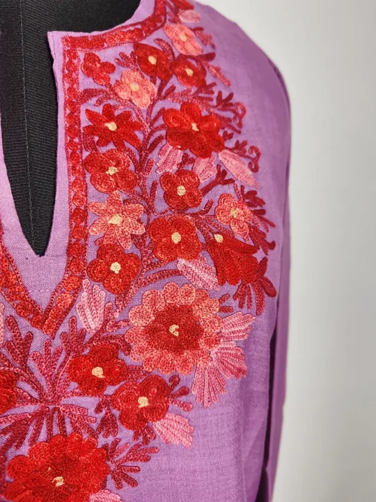 This Lavender short ruby cotton kurti is light, soft and very comfortable to wear in summer. The front has floral aari embroidery around the neckline that gives it a classic and graceful look, with matching work across the border. It is easy to pair with jeans, pants or palazzos for daily wear. An excellent and pretty pick from best short kurtis and cotton kurtas for summer, perfect for regular use and hot summer days.