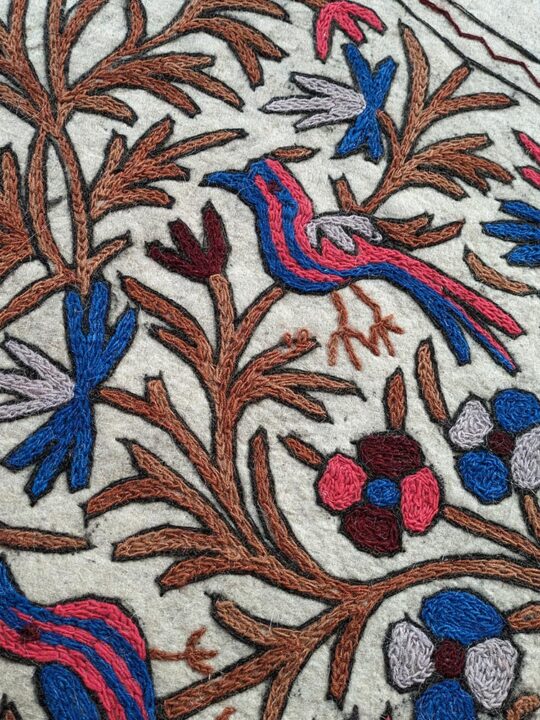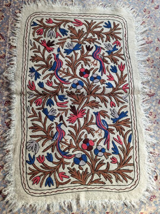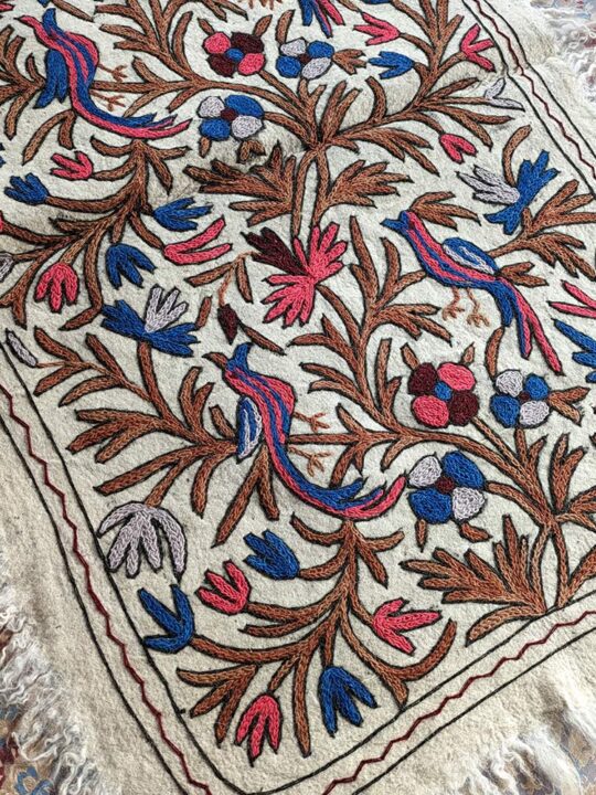 This beautiful rectangle Kashmiri Namda rug is made of sheep wool and embroidery is done by hand on it.