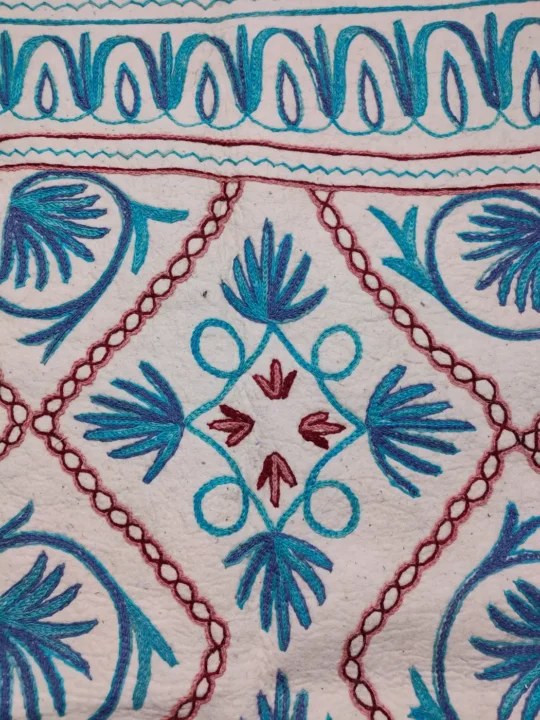 This pure wool namda is a traditional Kashmiri piece in 6×4 ft size. Its entire base is decorated with hand Aari embroidery stitched in blue threads, forming geometrical vine floral patterns. With both strength and warmth, it serves as a durable everyday floor cover and a piece of heritage art. It is a cultural treasure to keep your spaces rich and inviting.