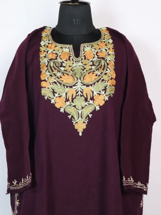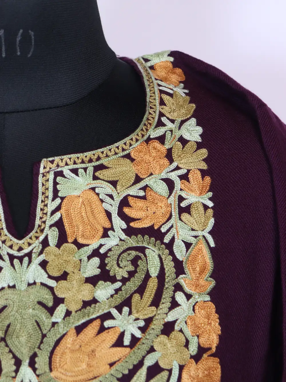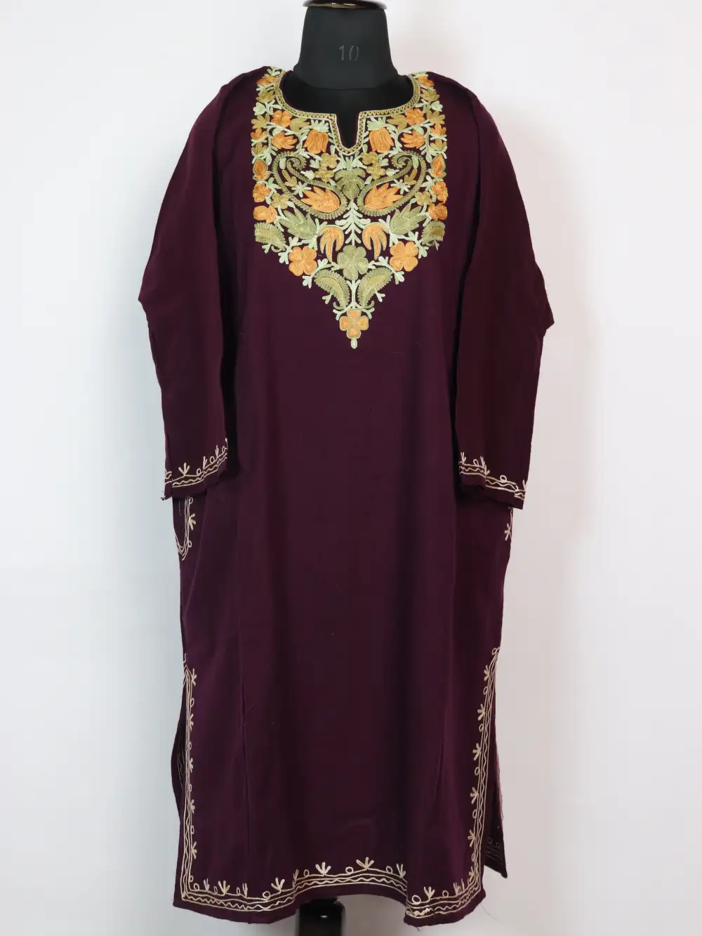 A purple traditional Kashmiri Pheran in Cashmilon Wool with Aari kadhai at the neckline in badam motifs. This purple feran carries a neat neckline while remaining simple and wearable—pair it with soft trousers or a warm shawl.