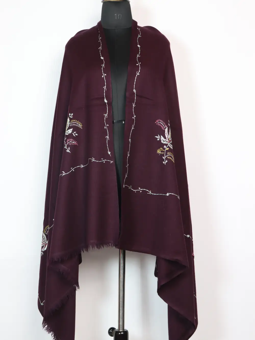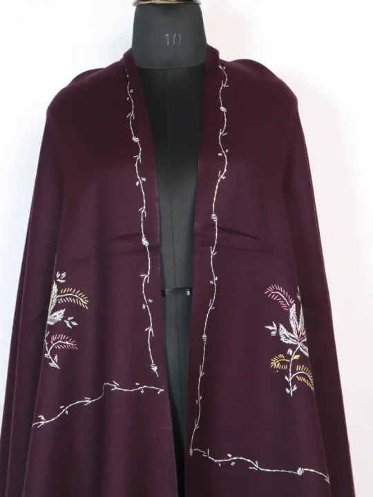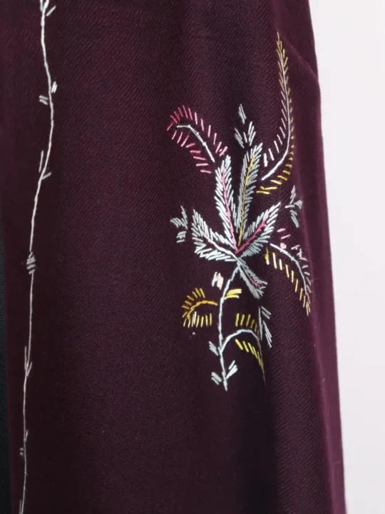 Cashmilon Wool and meticulous Hand Sozni border work frame this Kashmiri womens shawl, with white, mustard, grey and pink huge chinar motifs at each corner adds ceremonial sheen. This purple cashmere shawl pairs easily with winter dresses and formal sarees, brings handcrafted warmth and subtle shine.