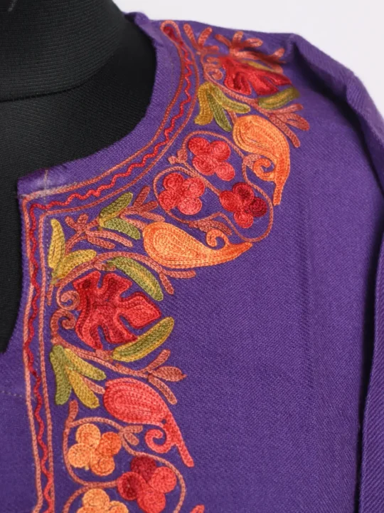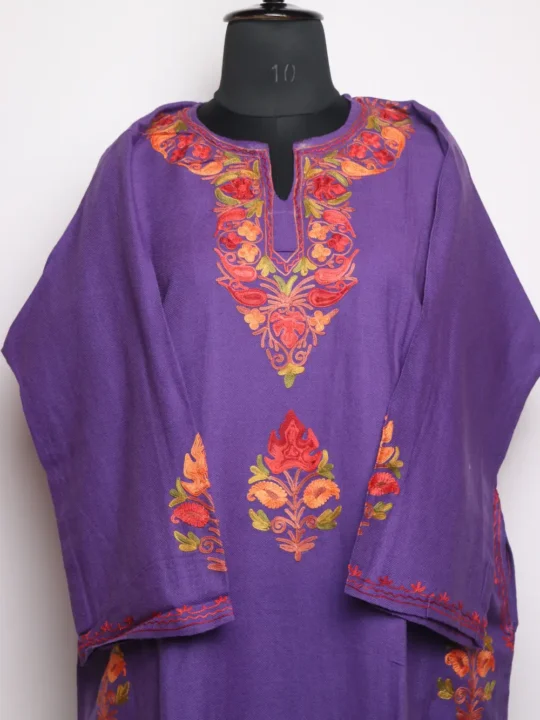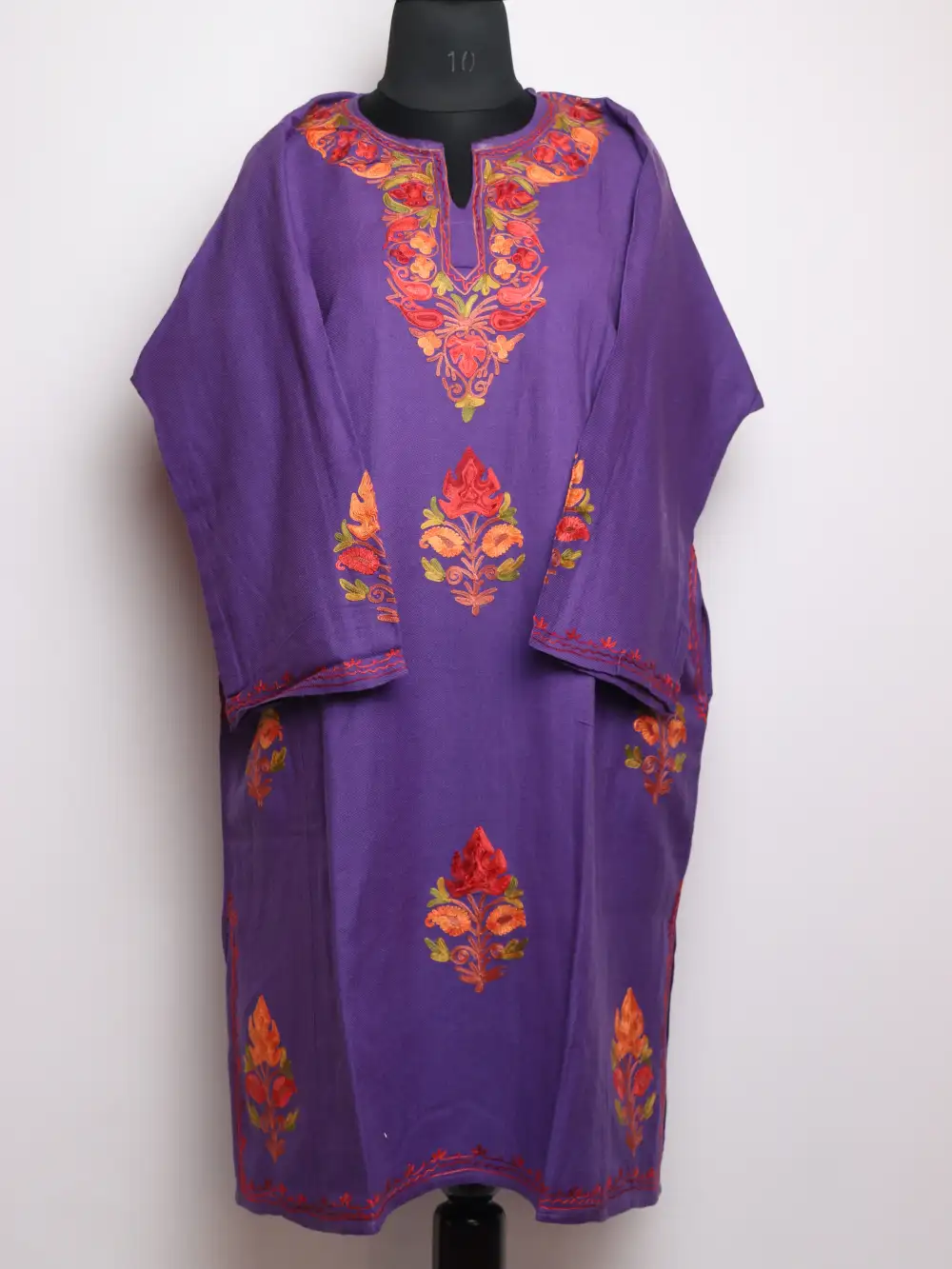 Crafted in Cashmilon wool. Stylish purple kashmiri pheran feels warm and wearable. It is enhanced with Aari embroidery at neckline and booti style front panel in floral and chinar motifs.