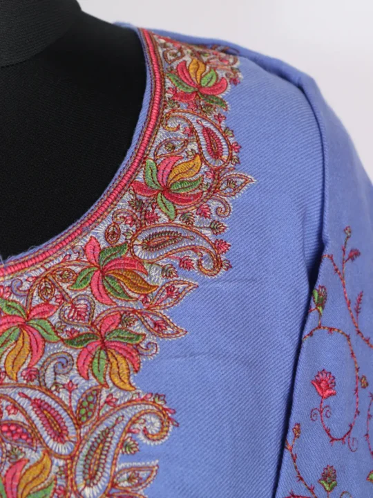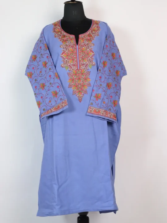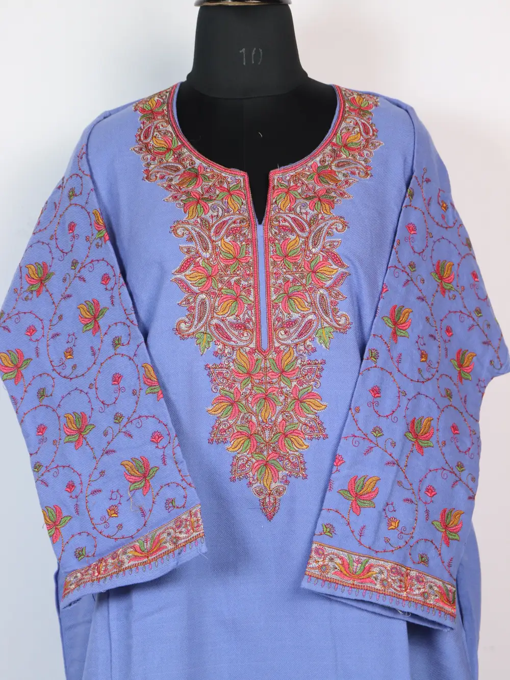 Made in purple cashmilon wool, this pheran highlights heavy floral badam embroidery in green, pink and mustard threads. The design rests on the neckline and sleeves, bringing a decorative richness. It is ight but warm, it carries comfort with an elegant detailing suitable for daily wear.