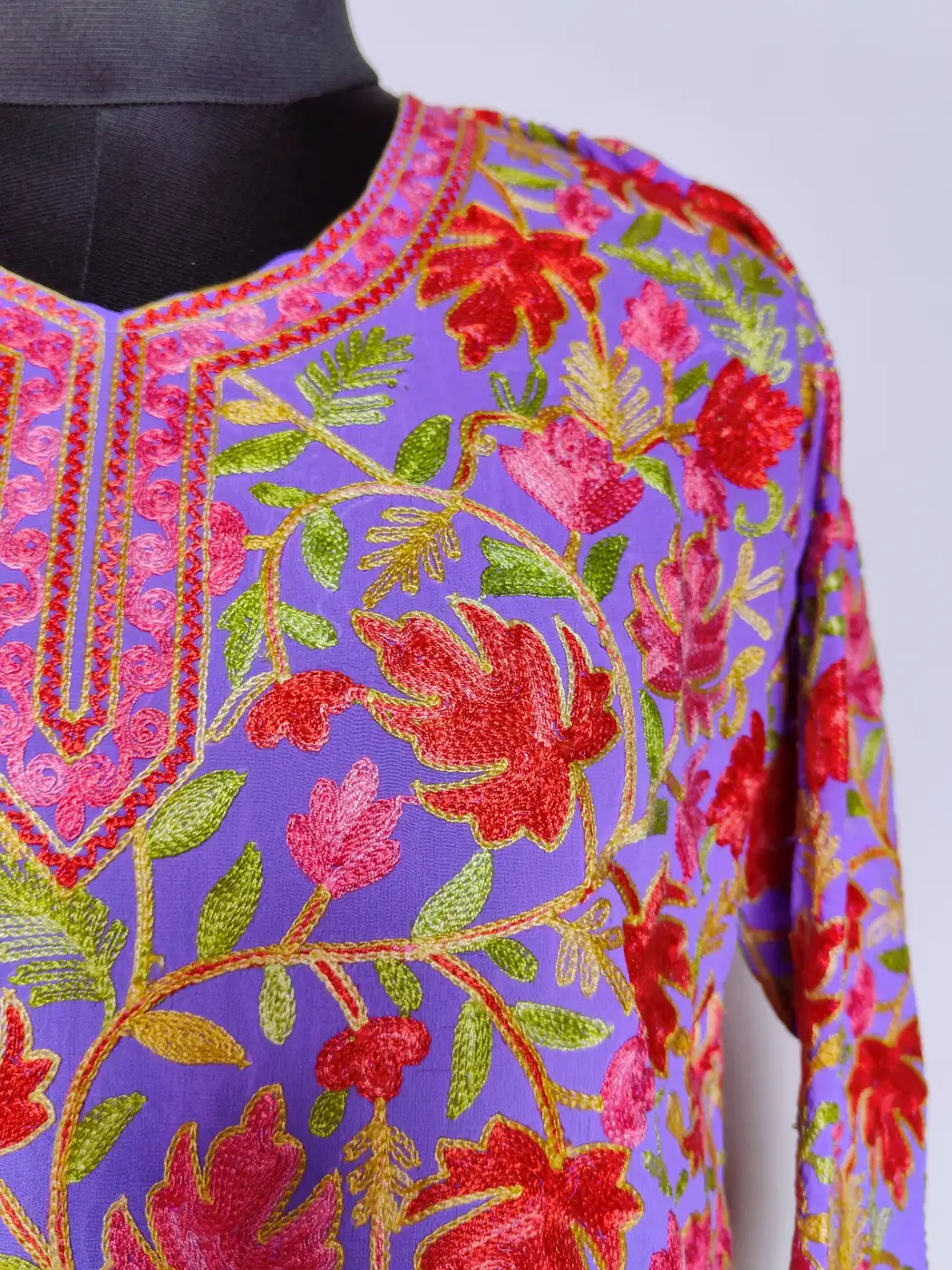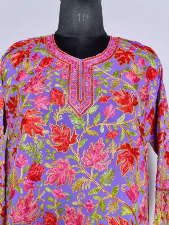 A soft purple base highlights this Kashmiri kurti, where chinari motifs appear all across the fabric. The neckline and borders feature continuous embroidery for a complete look. This georgette kashmiri kurti reflects light elegance with traditional influence.