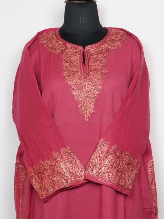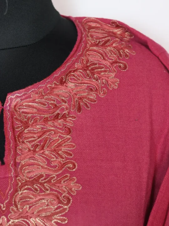 This Kashmiri feran in magenta cashmilon wool features zari embroidery near the neckline, sleeves and border. It represents Kashmiri heritage.