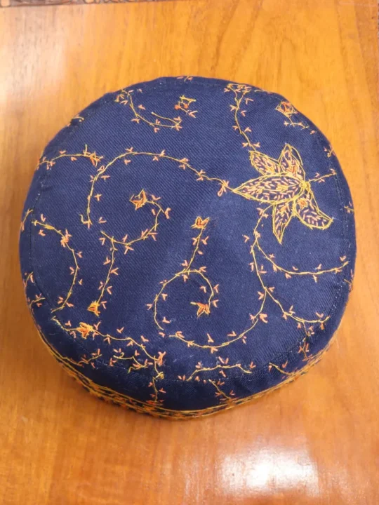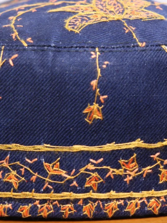 The blue Qalandar Bagh cap brings the poetic soul of Kashmir to life. Made from smooth Toosha fabric, it features big star shaped floral Hand Sozni motifs on top that mirror garden pathways and timeless serenity. Every piece reflects the peaceful elegance of Kashmiri artistry, stitched into form in the heart of Srinagar. A cap that wears like a memor
