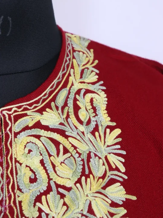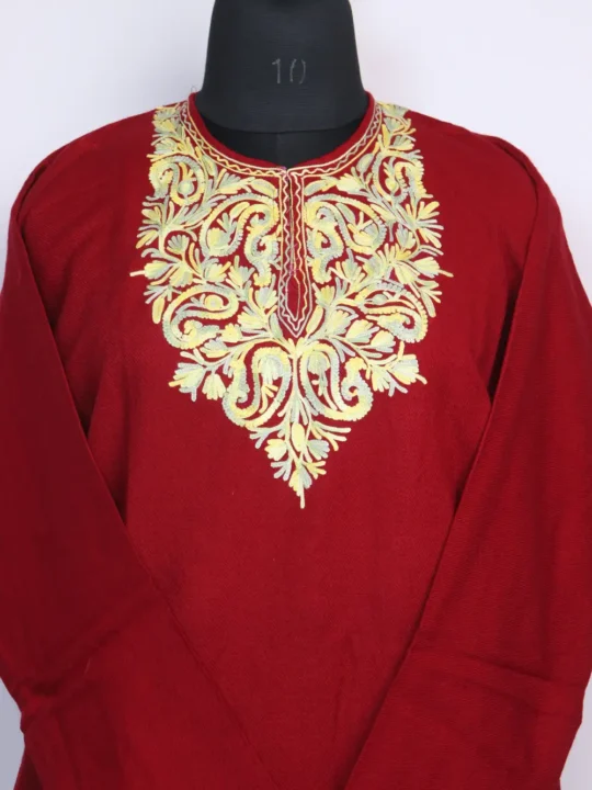 Red embroidered kurta for ladies in Cashmilon Wool holds badam motifs in Aari kaam at the neckline, and pockets on both side add practical function for daily use.