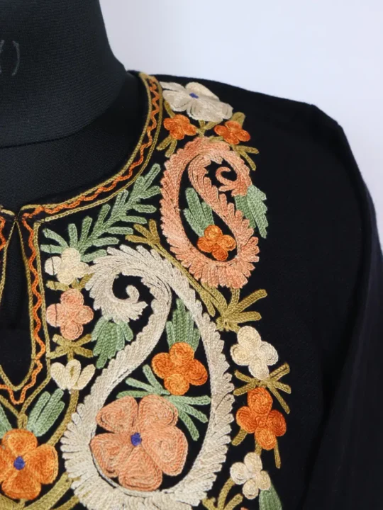 Elegant and warm, this Cashmilon black wool pheran is beautifully detailed with floral embroidery across the neckline and sleeves. The soft texture and two side pockets make it both fashionable and functional for cold days.