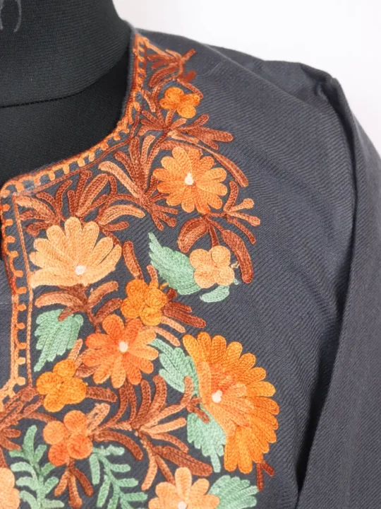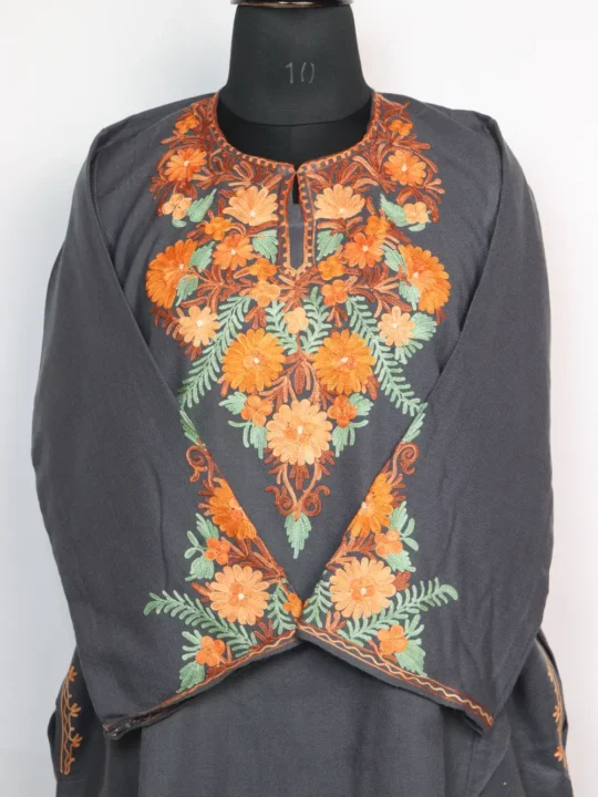 A perfect blend of stylle, thisĀ  grey Cashmilon pheran features delicate floral embroidery around the neckline and sleeves, that enhances its grace. Crafted for winter comfort, it comes with two functional side pockets for warmth.