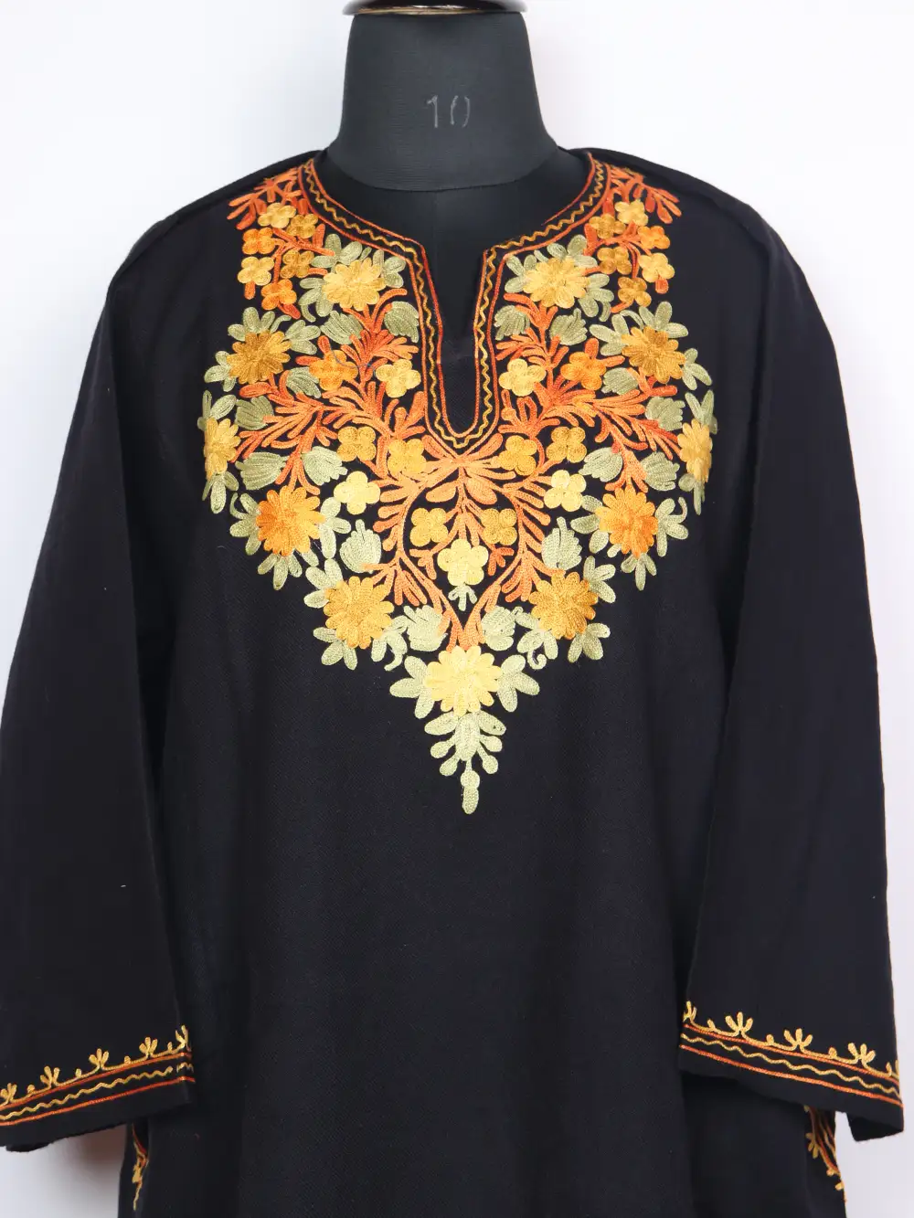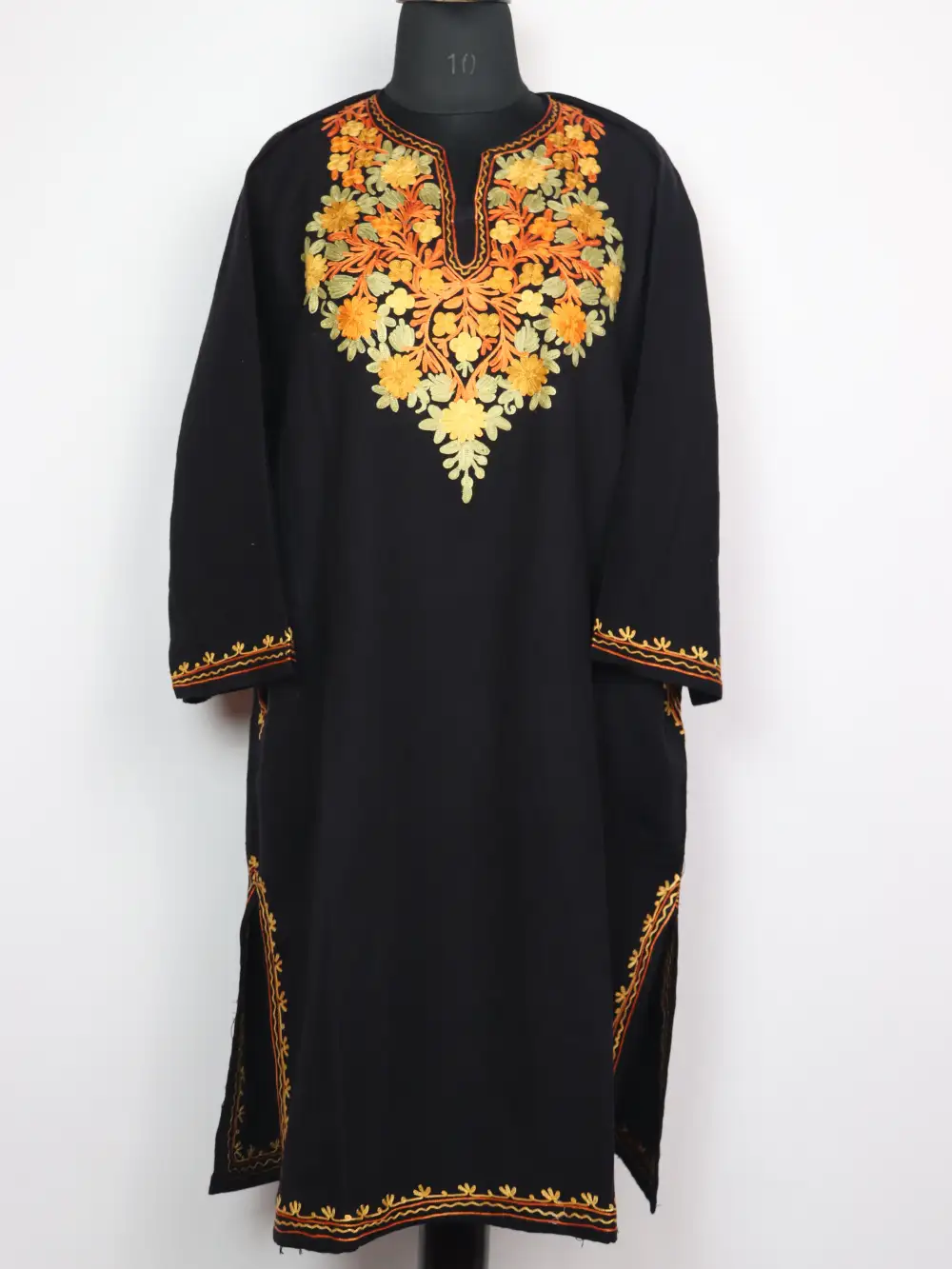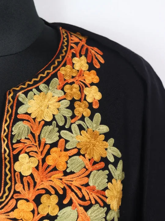 Cut in cashmilon wool, this black colour stylish Kashmiri pheran offers a sturdy fit with refined fall. It features aari embroidery in floral patterns at neckline and comfortable body cut. It has chest size 50 inches and length 43.5 that lend roomy movement while keeping a subtle Kashmiri elegance.