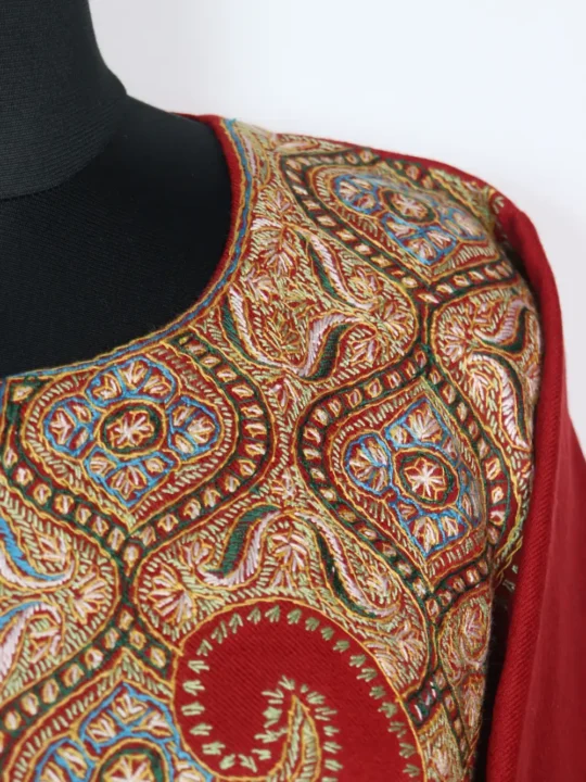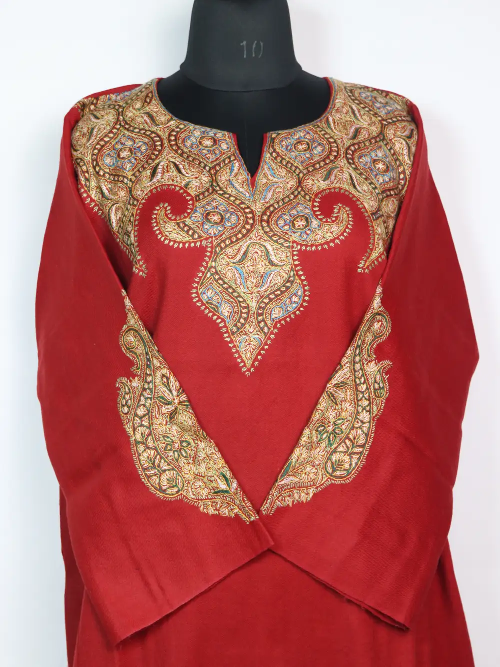 Raffal Wool in chilly red forms a kashmiri phiran adorned with curved hand sozni at the neckline and sleeves. It comes with chest size 52 inches and length 42 inches offer comfortable proportions.