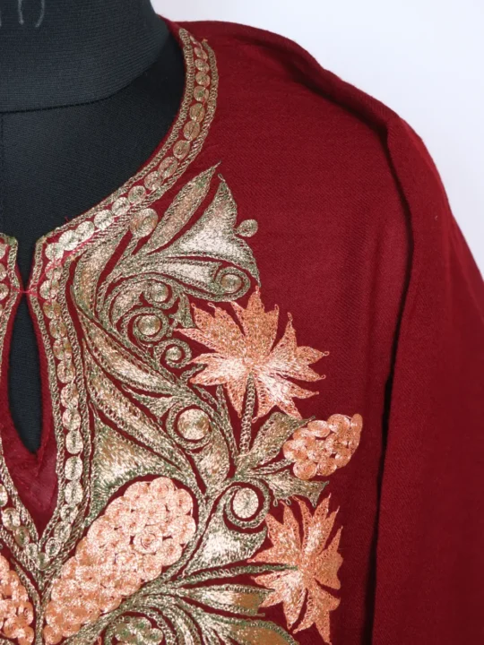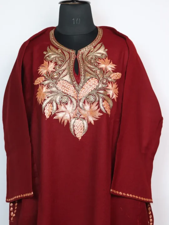 A refined raffal wool Pheran in maroon hue adorned with Botte Tilla floral badam at the neckline reads quietly ceremonial, Its chest size 56 inches and length 43 inches gives it a flowing fit. This maroon Pheran places metallic floral motifs where they show most and keeps the rest of the body pleasantly plain for balanced Kashmiri style.