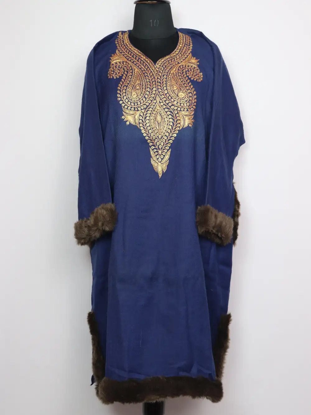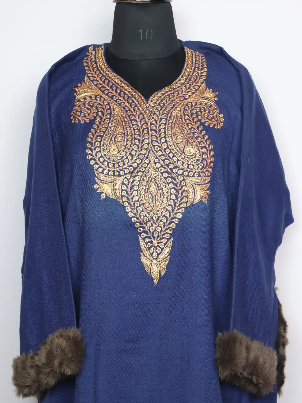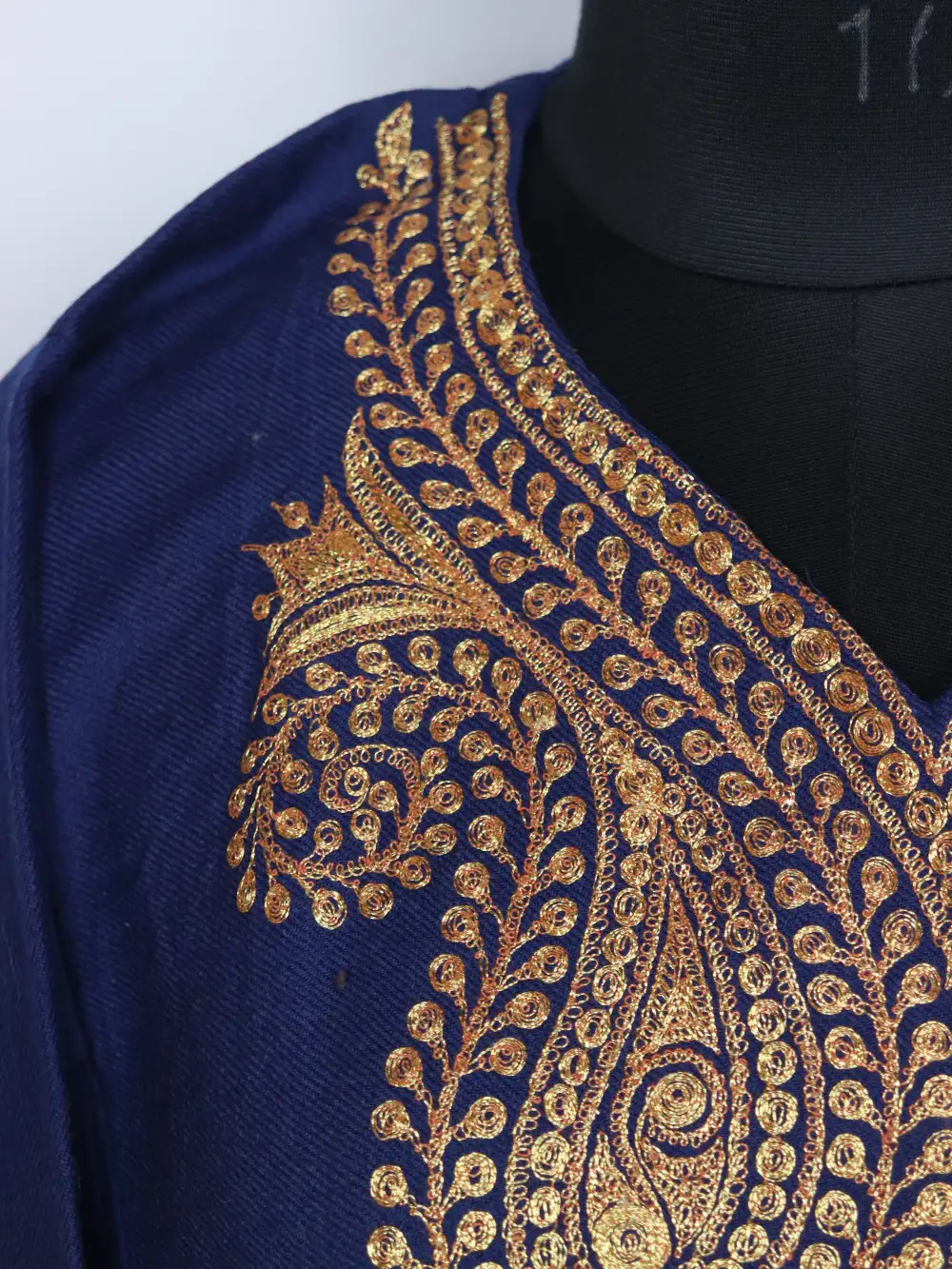 Made in Kashmir with raffal wool, this dark blue pheran displays botte tilla kadhai at the neckline. It includes pockets on both sides and for practical storage.