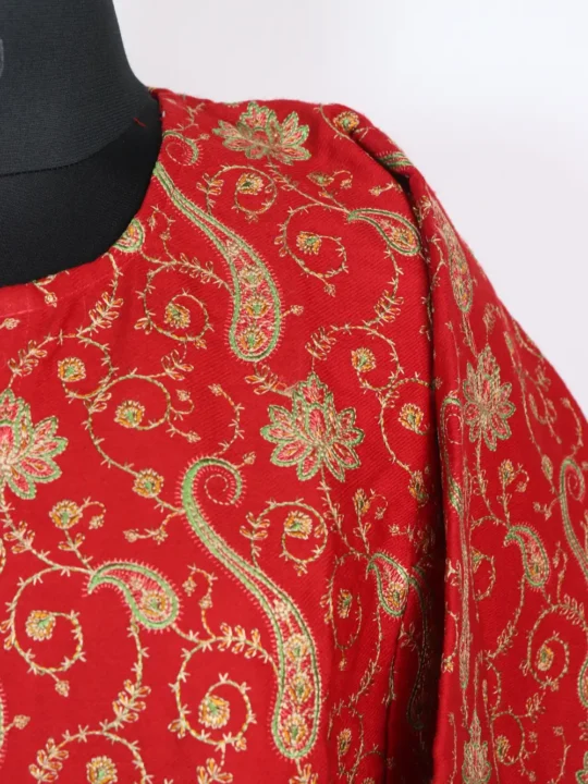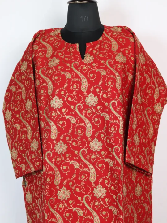 Warm and soft, this red raffal wool pheran shines through its elaborate design. The sleeves’ cuffs and hemline carry heavy embroidery, with a spread of jaal all over the front panel enriched with green-magenta badam and floral motifs. A detailed yet wearable garment, which makes it perfect for making winter styling elegant.