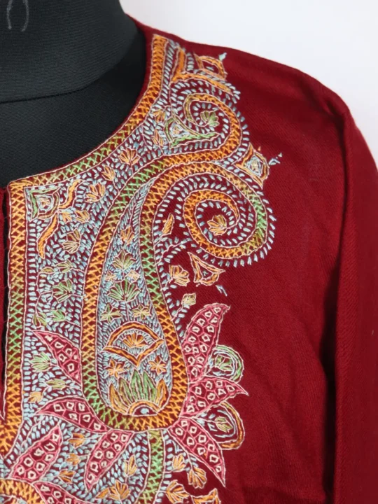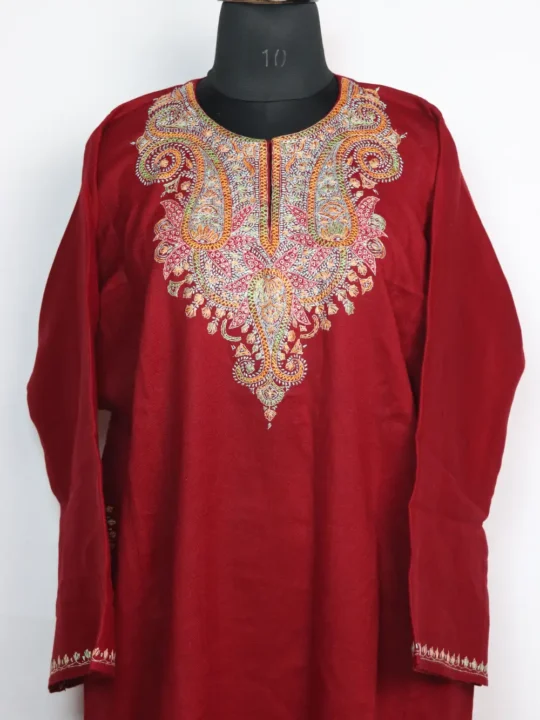 This traditional maroon pheran is made from soft, warm Raffal wool for winter. It features multicolored Hand Sozni embroidery around the neckline and it includes pockets both side for everyday use.